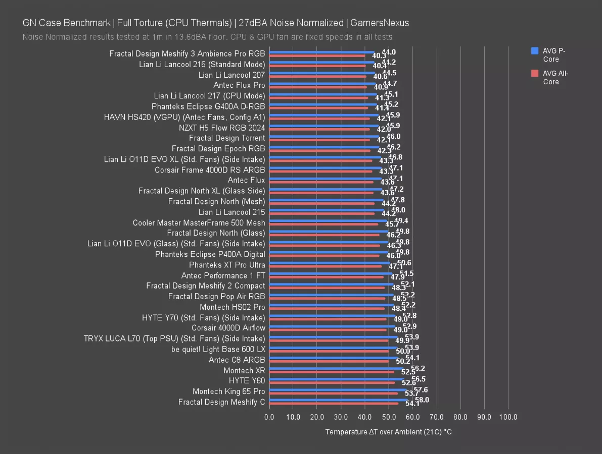 With all case fans at full speed, the all core CPU average dropped to 42 degrees above ambient and the P-Core average dropped to 46. Moving the PSU to the top of the case dropped both averages by about two degrees, which is actually a noteworthy improvement and beyond just error. This change would also affect flow-through behavior, which we’ll look at in the GPU chart.
