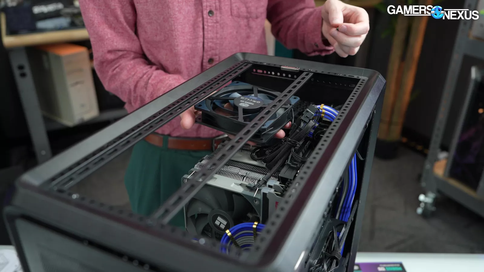 In all configurations, we kept the PSU fan oriented to pull air from the exterior of the case (facing away from the PSU shroud). The GPU support was not installed for any thermal tests.