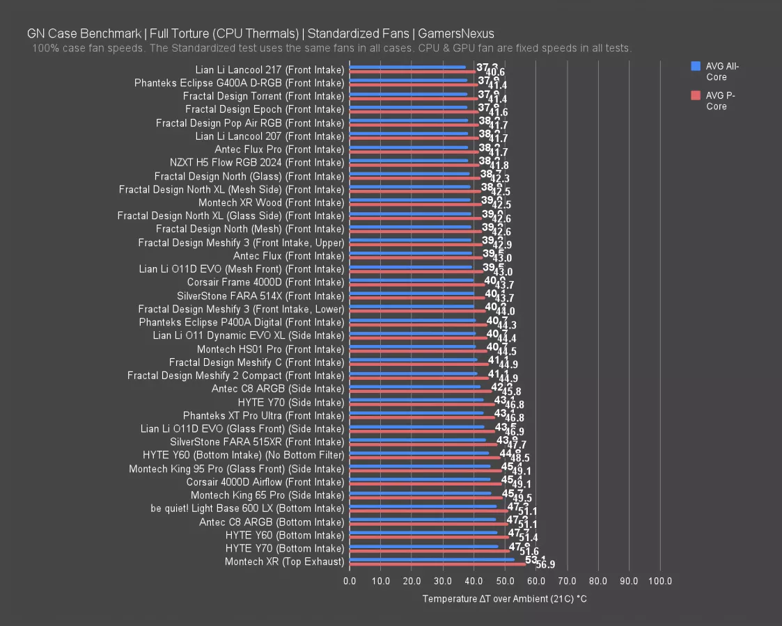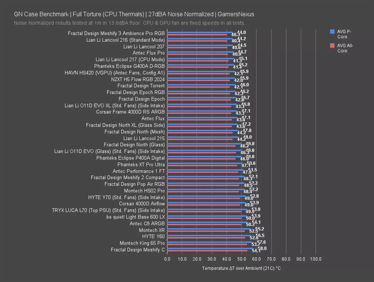 The Phanteks XT Pro Ultra was even warmer than the glass North, which means the Epoch is also better than the XT Pro Ultra. The Corsair Frame 4000D RS was within error of the Epoch and functionally the same, which makes sense given the similar layout and fan arrangement. The most serious competition comes from Lian Li's dirt-cheap Lancool 207 (read our review) with its 41 degree average, as well as the more expensive 217 (read our review), also at 41. These cases are at about 45 degrees for the P cores.