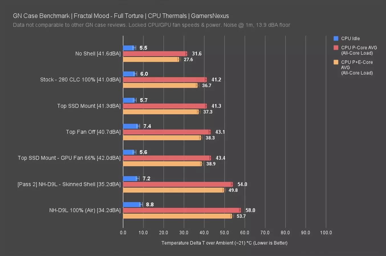Switching to air cooling with the NH-D9L at 100% fan speed results in a P-core average of 58 degrees over ambient. The point of this isn’t to compare a tiny tower cooler to a 280mm radiator -- that’s just a cooler review, which we do separately -- but to see what happens when we take away the intake air restriction presented by the fabric cover.