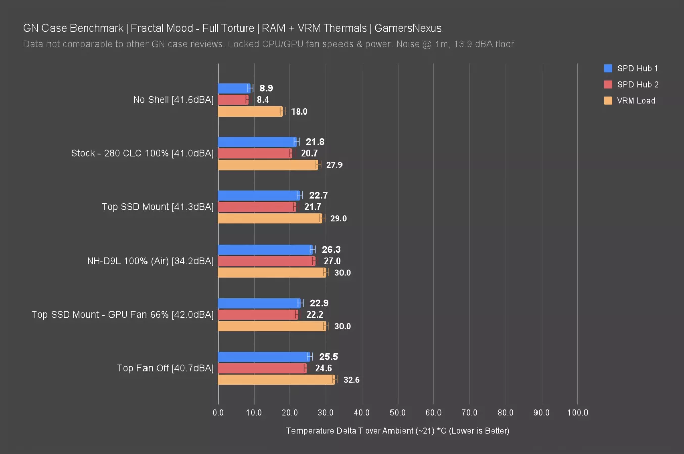 Moving to VRM and RAM thermals again shows us how restrictive the Mood’s shell is, with the no shell result coming in much lower than anything else. The bottom end of the CPU side of the case just doesn’t have anywhere for air to go, which can affect VRM temperatures and RAM.