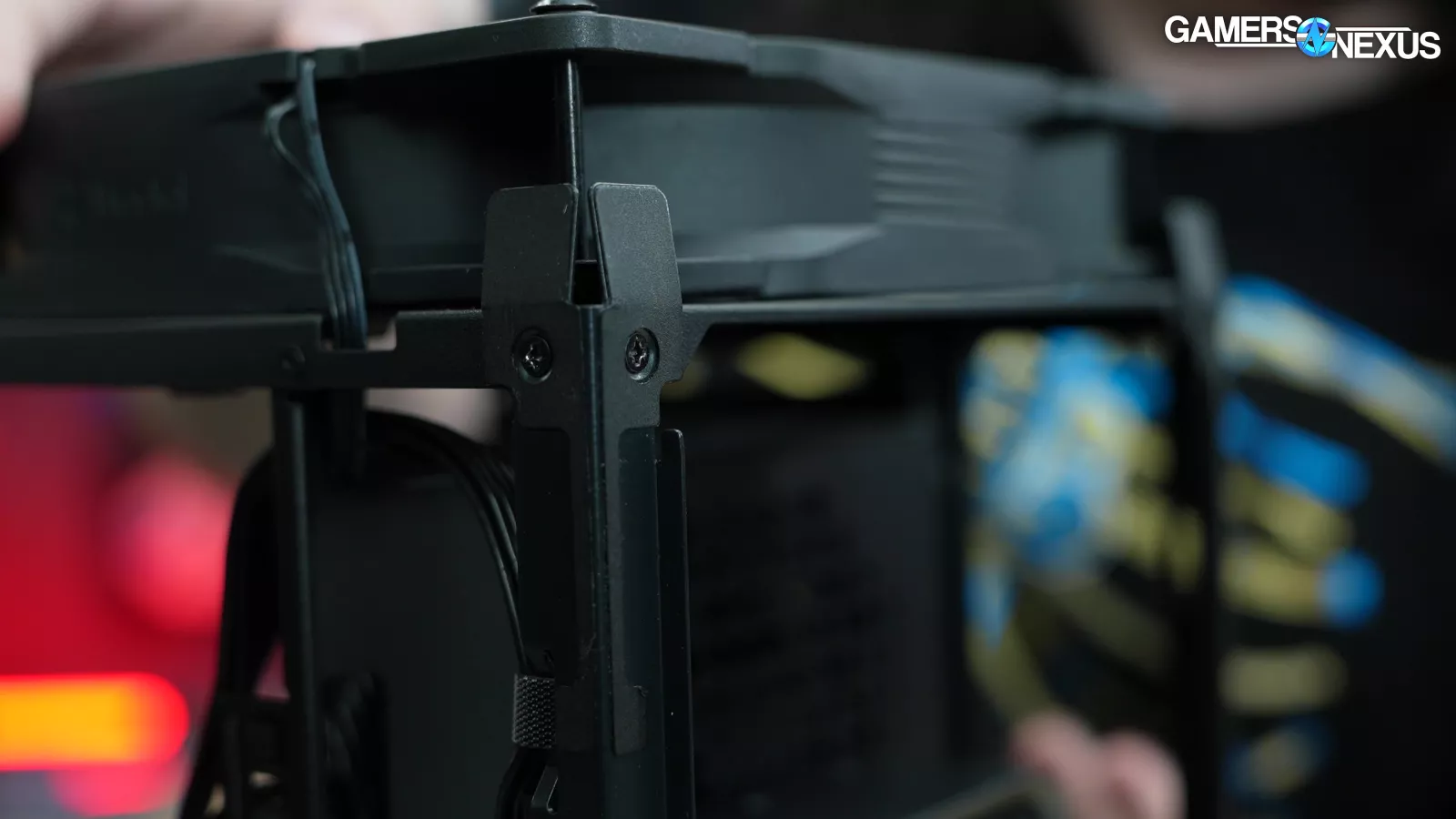 The other is the top mount we previously mentioned. It goes between the PSU and the top exhaust fan, and requires temporary removal of the fan to install. This is a pretty weird spot, and the bracket isn’t ventilated at all, and contributes to blocking off the Mood’s only exhaust. That’s especially true for the PSU exhaust, which ends up significantly blocked. This has a big thermal impact that we’ll get to later.