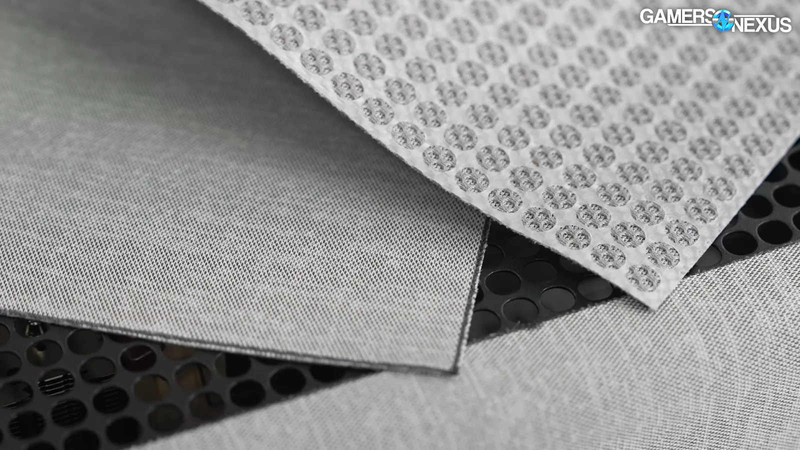 Underneath the exterior layer is a structural weave, and underneath that is a layer of perforated plastic with holes that align with the holes in the panel. This plastic also seems to act as the adhesive holding the fabric in place. Only the front and rear of the case has ventilation for intake – the sides are totally solid, which is intentional.