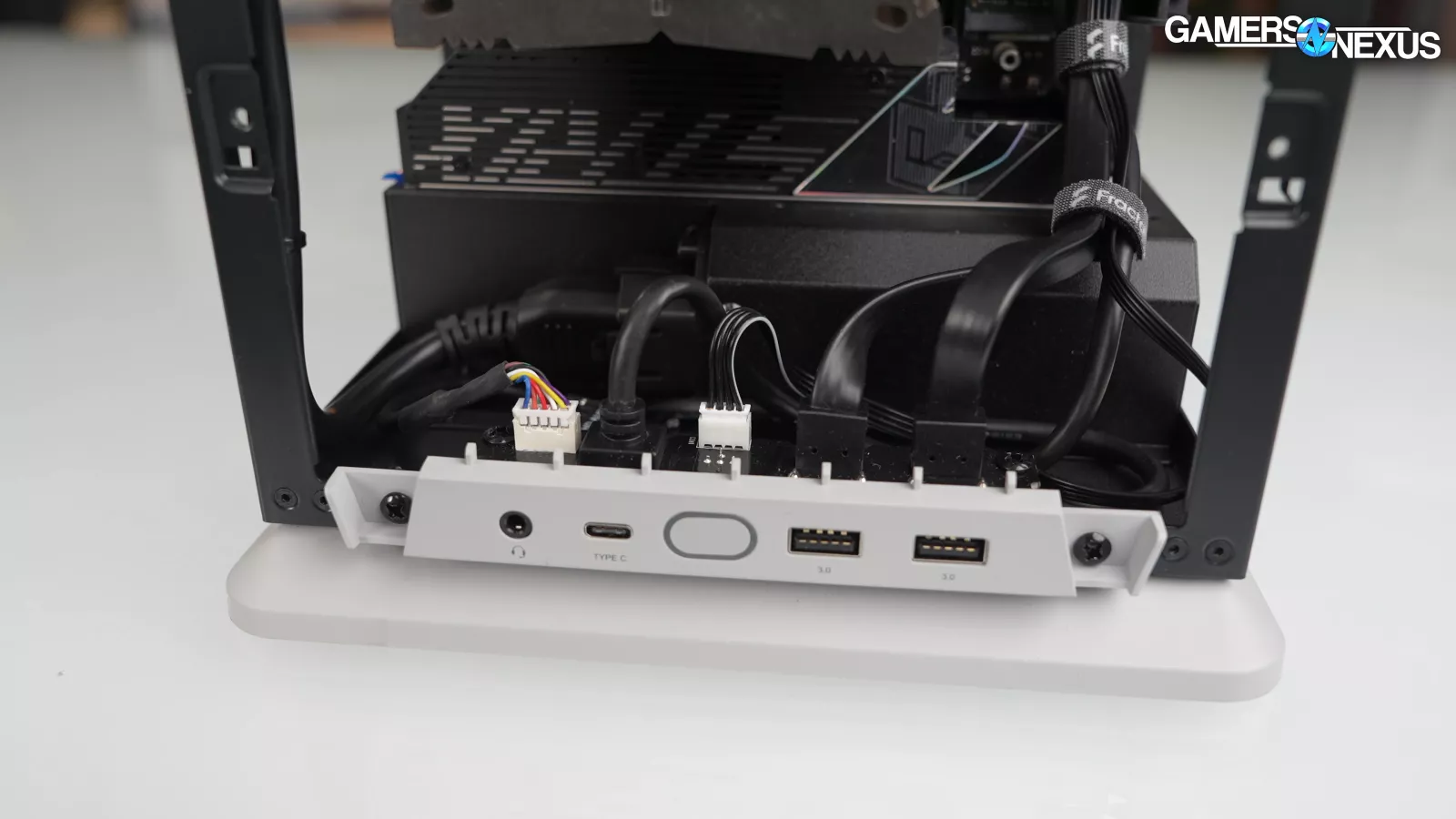 GPU exhaust from the flow-through portion of the card normally is able to go into the PSU and then out through a slot above it, but the SSD bracket blocks off a significant amount of that slot. Between that and the CLC fan actively blowing air towards the PSU exhaust, it doesn’t have a fighting chance of helping to evacuate the GPU’s exhaust. It’s possible to flip the PSU around so the fan faces the other way, but then the GPU would just be blowing into a wall.