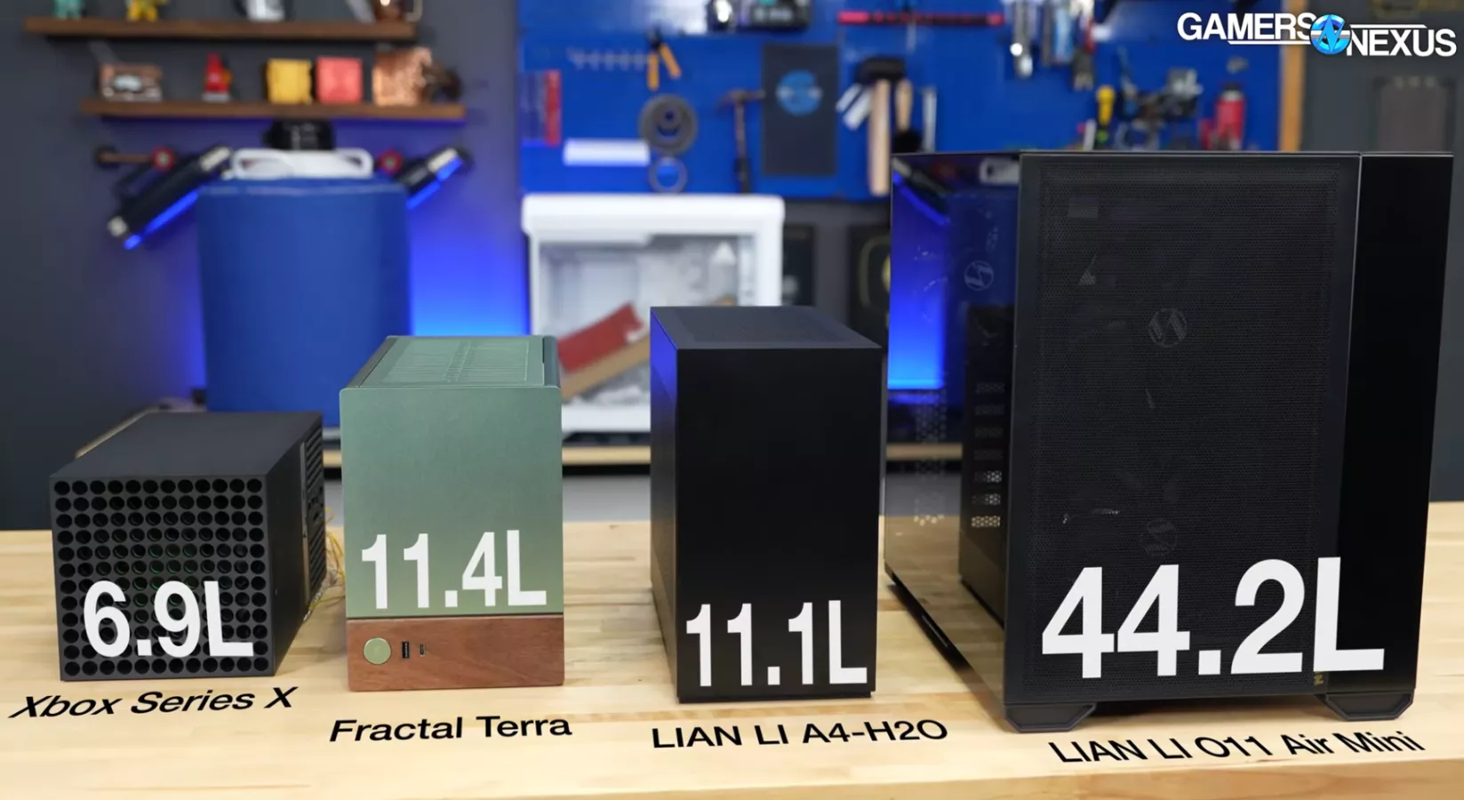 For other dimensions, the Terra is 343mm long, 153mm wide, and 218mm tall, with an external volume of 11.4L. The Lian Li O11 Air Mini is 44.2L, the A4-H2O is 11.1L, and the Xbox Series X is 6.9L.