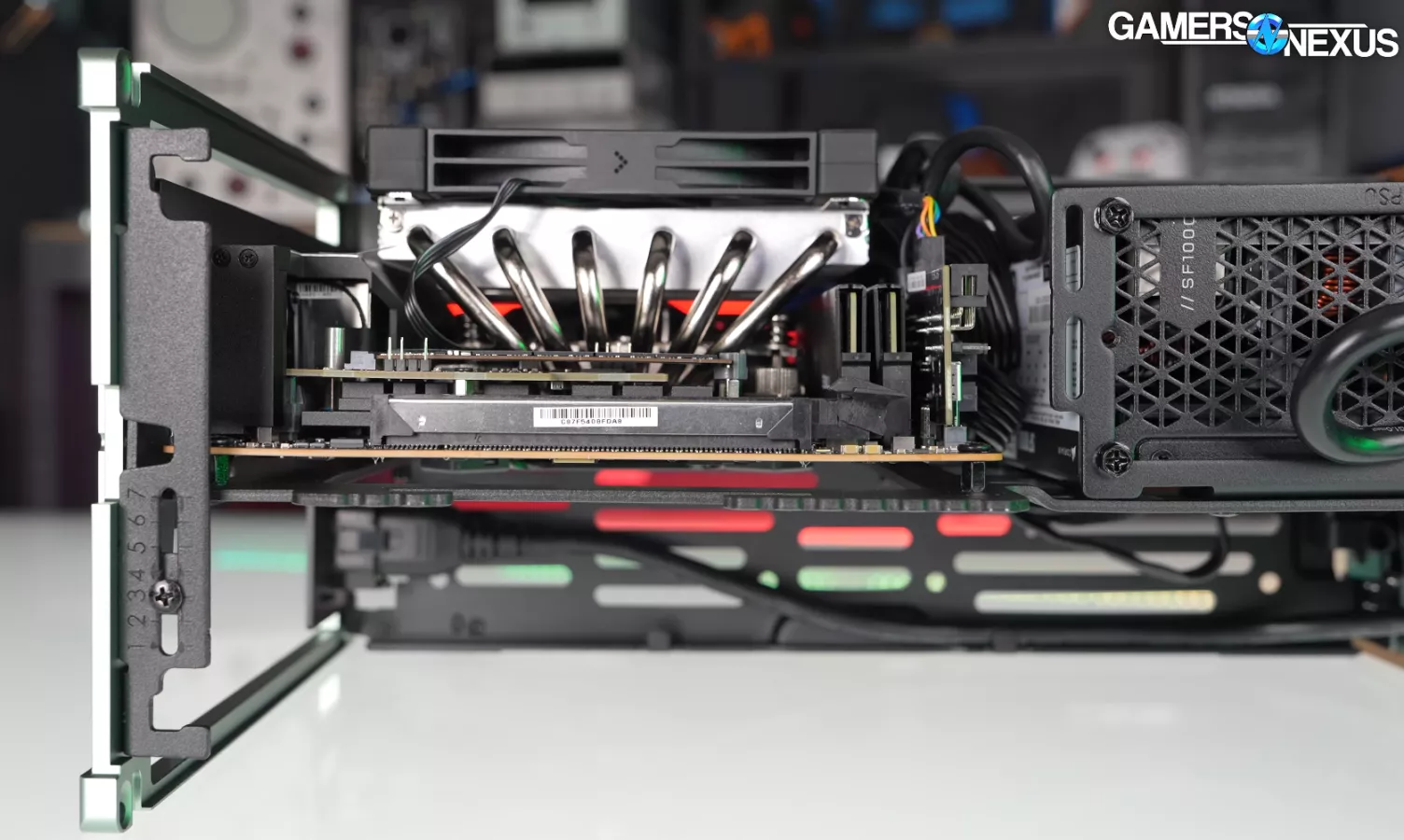 At 77mm of CPU cooler clearance, coolers like the Noctua NH-L9x65 would fit at 65mm or the DeepCool AN600 at 67mm (which is what we used). The 37mm tall Noctua LH-L9i would fit in the 48mm clearance configuration. There are other options too, including from SilverStone, but you’re going to be extremely constrained on CPU choice if fully biasing to accommodate the GPU. It’d be an imbalanced build.