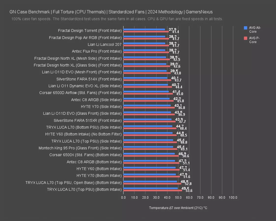 On the CPU with standardized fans, we measured CPU temperatures at 38 degrees above ambient all-core and 42 degrees for the P-cores, within error of the top-scoring Torrent. Mesh fronted cases with straightforward front-to-back airflow patterns do well in this test, and the 207's CPU thermals are particularly good because the front fan slots are biased high, sending more air above the level of the GPU backplate. We usually try to position the intake fans for a better balance with GPU thermals, but that's not an option in the 207.