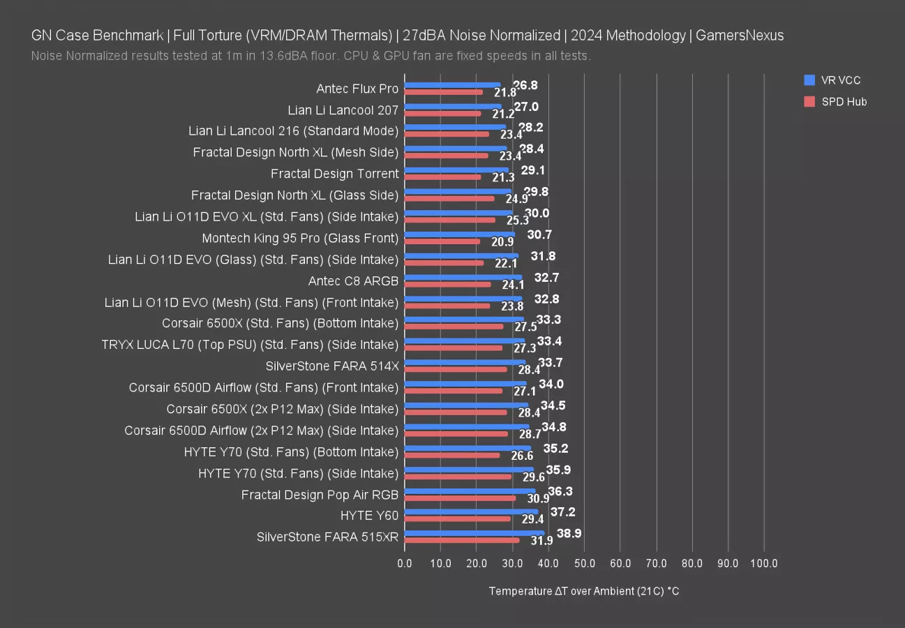 The 207 is a loud case with all fans at full speed, but we'll start with noise normalized results. For this testing, all case fans are lowered to reach a target noise level of 27 dBA measured at 1 meter in our hemi-anechoic chamber, with CPU and GPU fan speeds controlled and constant.