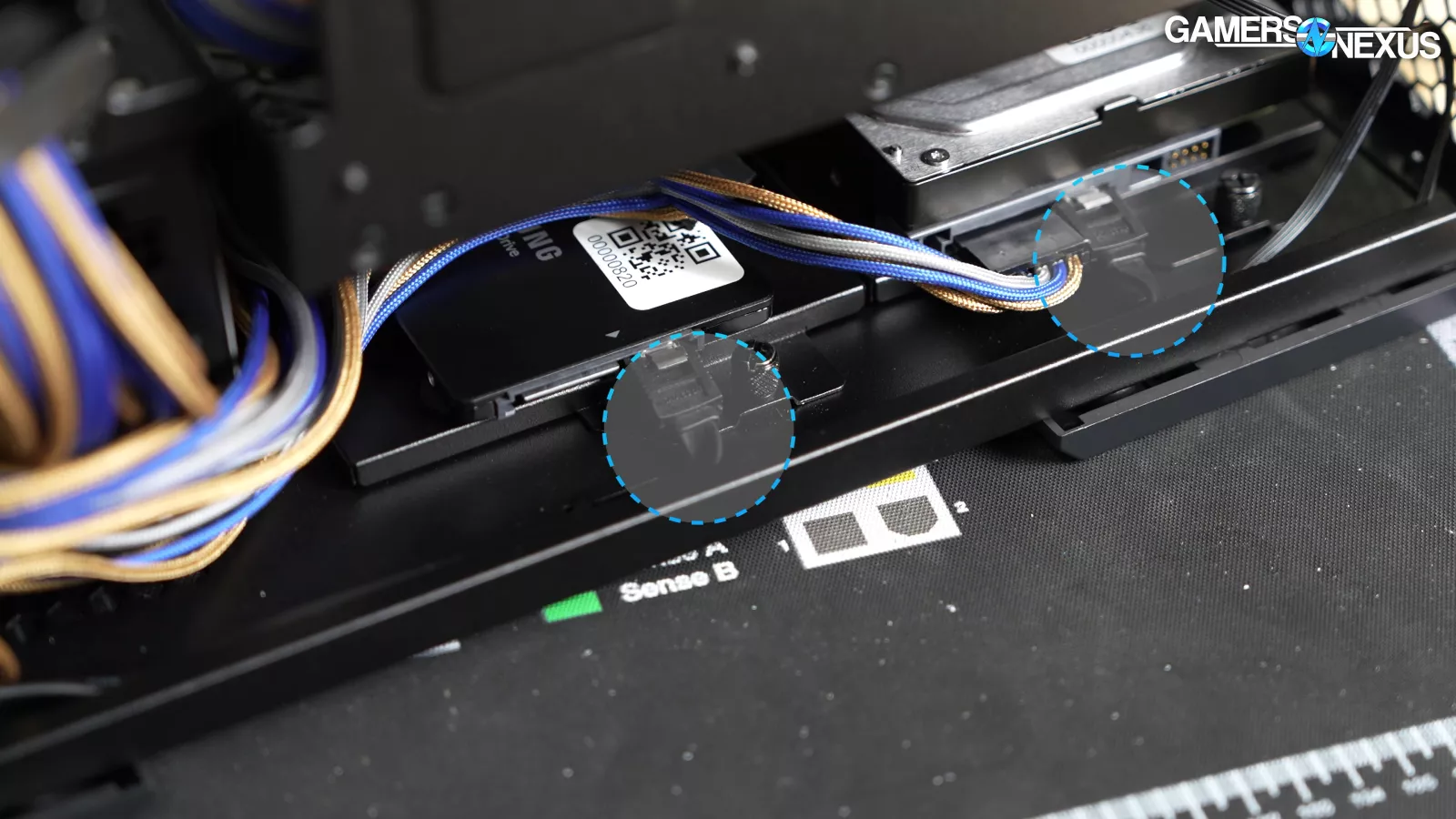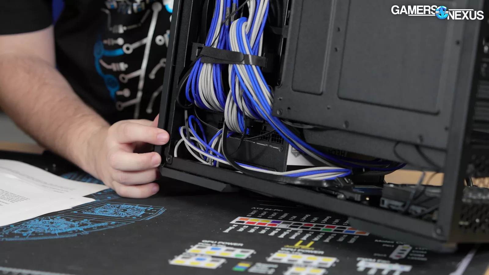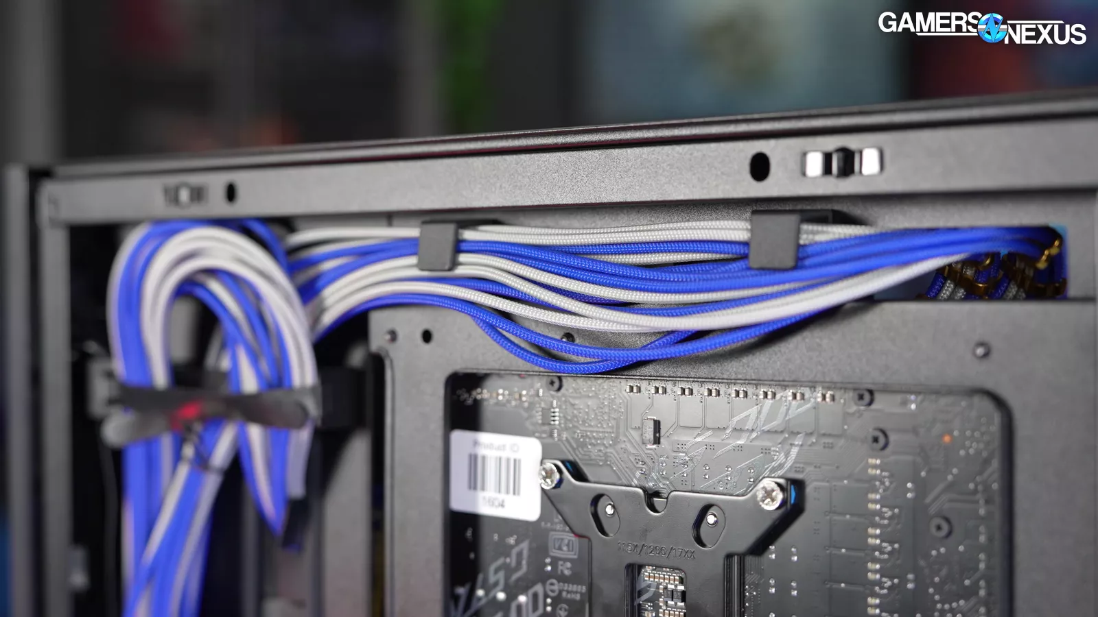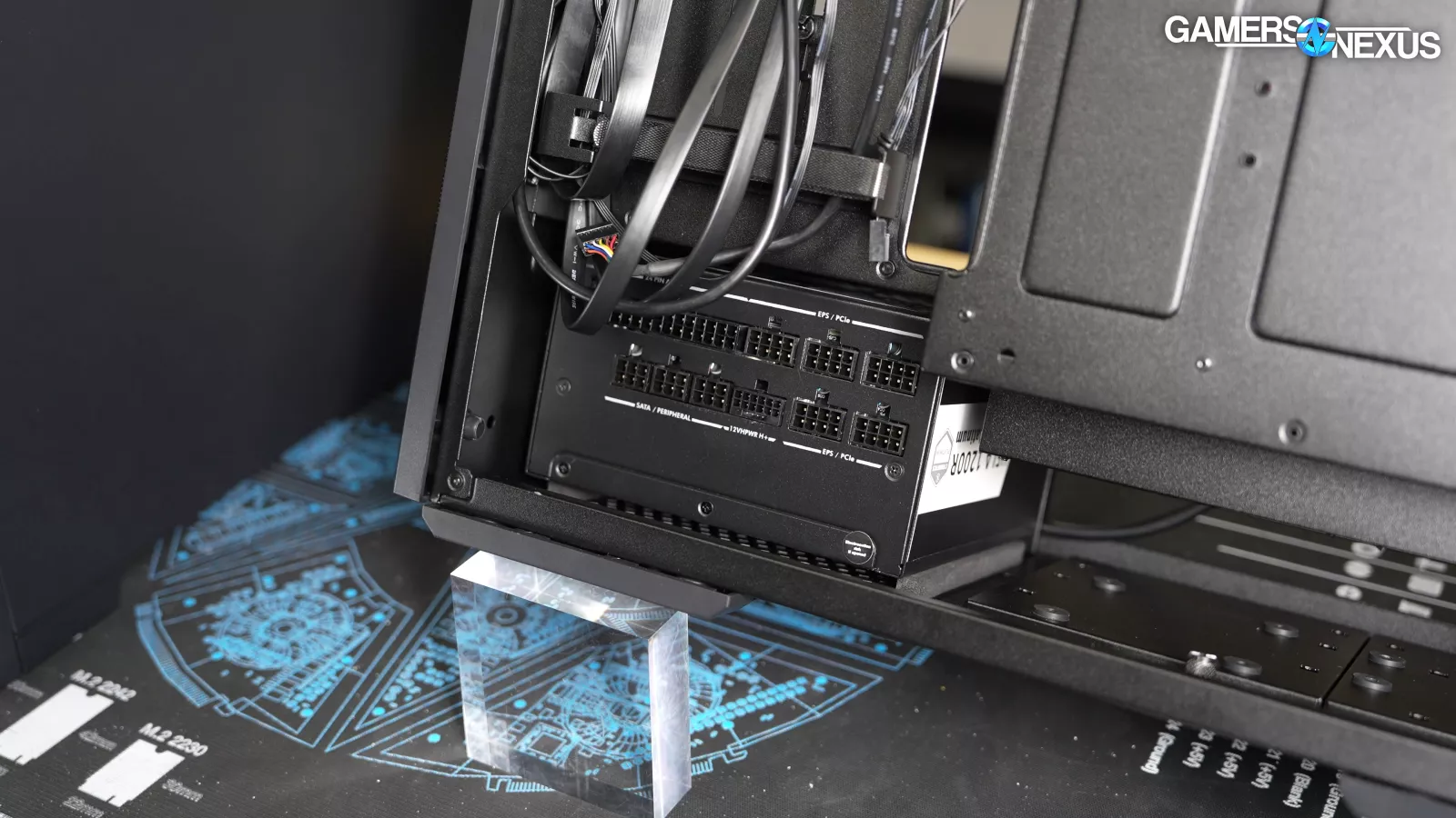 In another major concern, in Lian Li’s quest to move the power supply, it has overlooked both cabling and cooling considerations. With the bottom filter installed, which we’ll come back to, the power supply is given mere millimeters to breathe with a bottom-oriented fan. We don’t currently run power supply thermals during our testing; however, this will cause the power supply to heat up, objectively, and it may result in the PSU fan running at a higher RPM (if it is a power supply that bases fan speed on any internal temperatures).