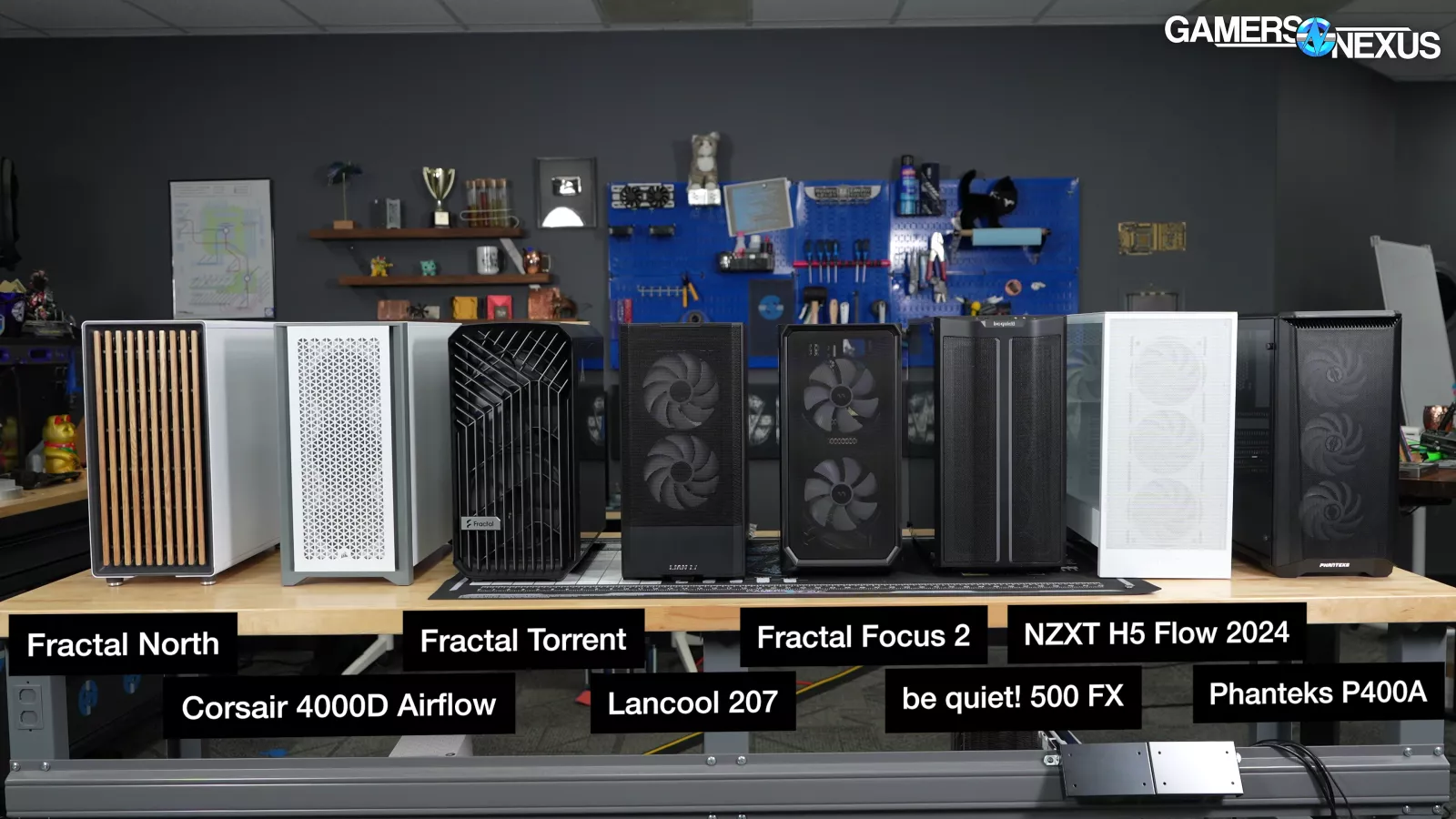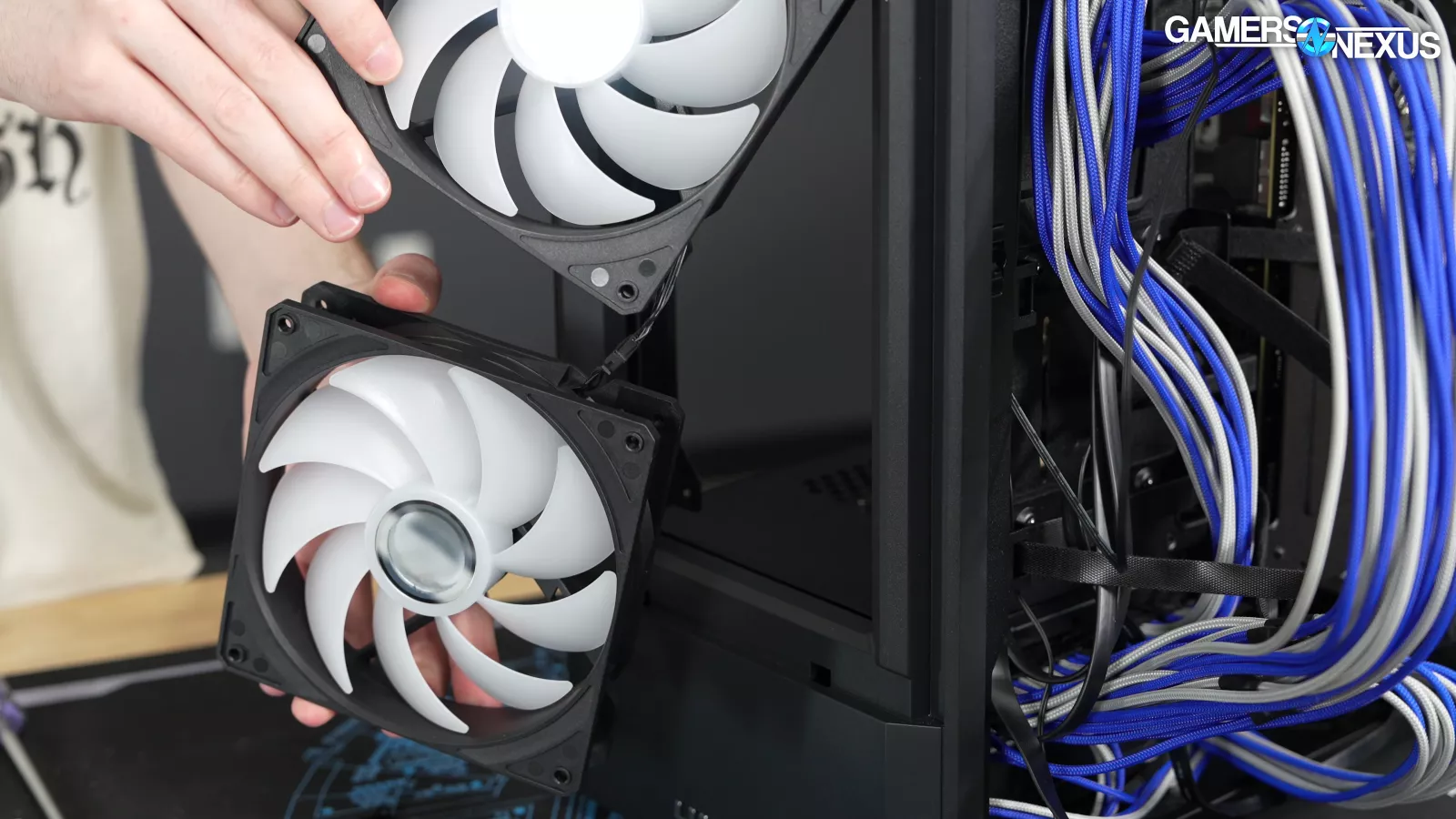Our standardized fan tests use three Noctua fans, always the same ones: two 140mm front intake, and one 120mm rear exhaust, all at 100% speed. We regularly explain the limitations of this testing. You can learn more in our methodology piece here. This allows us to remove stock fans as a variable and compare just the enclosures. With cases like the 207, the comparison is theoretical (since it doesn't make any sense to replace the stock fans), but people request it, so we wanted to provide the data.