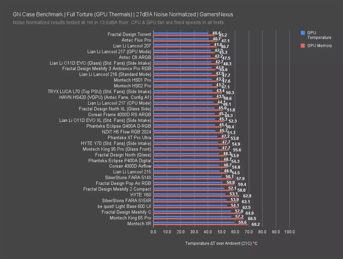 Lian Li's older Lancool 216 also remains unbeaten here, with thermals that closely match the Meshify 3 and are therefore pretty close to the 217 as well. The 216 had highly unusual 160mm intake fans, especially for the time, with extra-wide frames to prevent air re-circulation, and we found them effective in our review and that still holds up today.