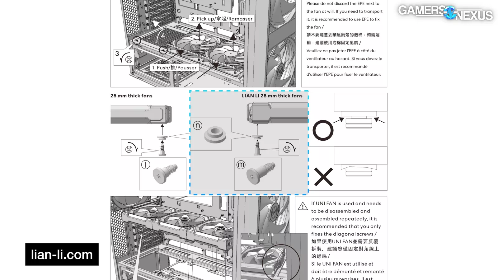 Lian Li also included a full set of longer screws to make the tool-less mounting system work specifically with the 28mm-thick UNI fans.