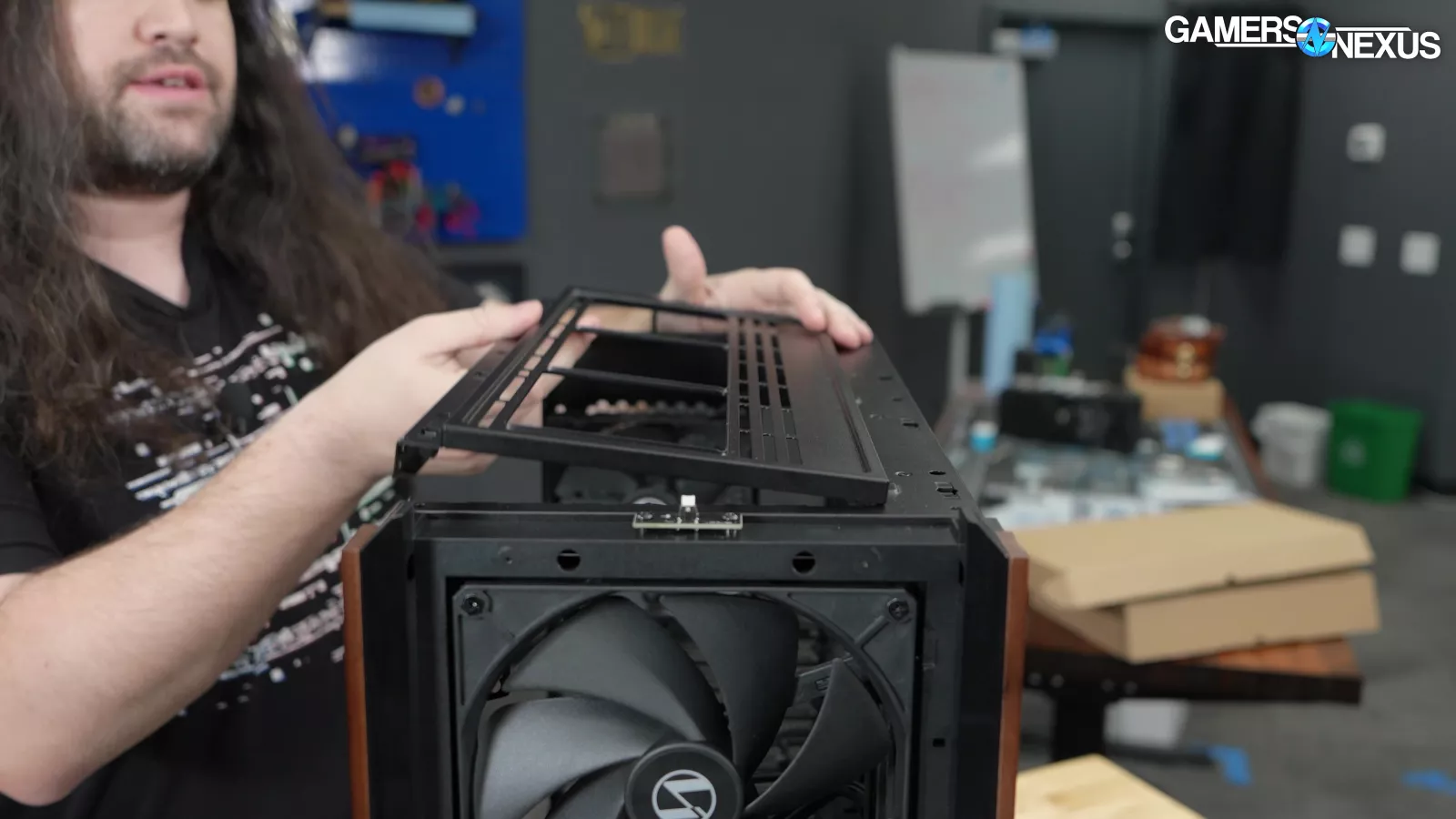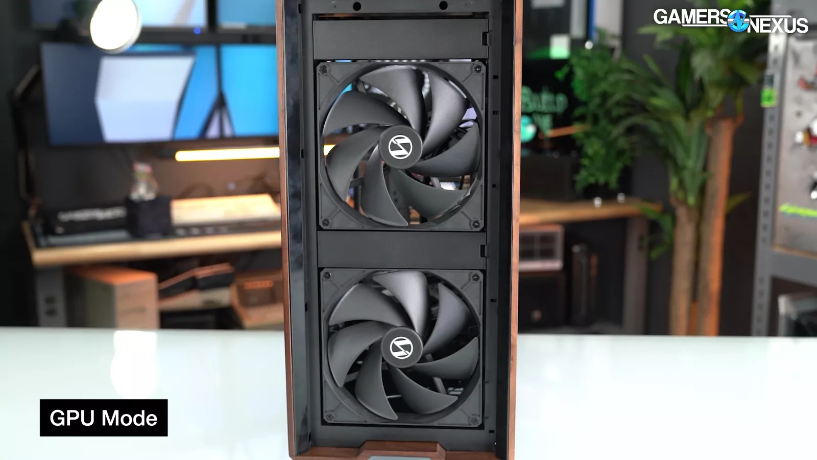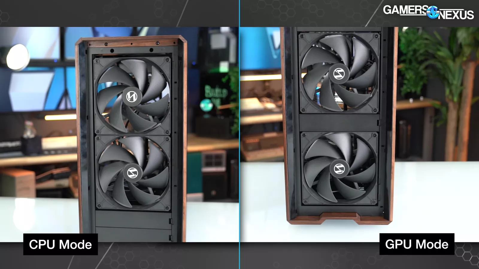 Let's start with "CPU Mode" and "GPU Mode." This is something Lian Li has done in the past but have changed their execution this time. The two front 170mm fans are attached tool-lessly by screwing rubber washers onto the fans and then sliding them into place, a common method for installing storage drives. Between these fans, two plastic blanks can be inserted like old-school 5.25" covers. The blanks also help to guide flow and prevent re-circulation.