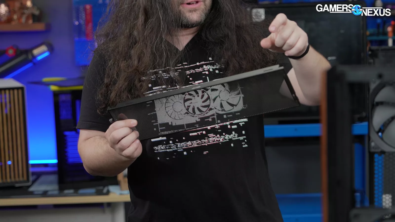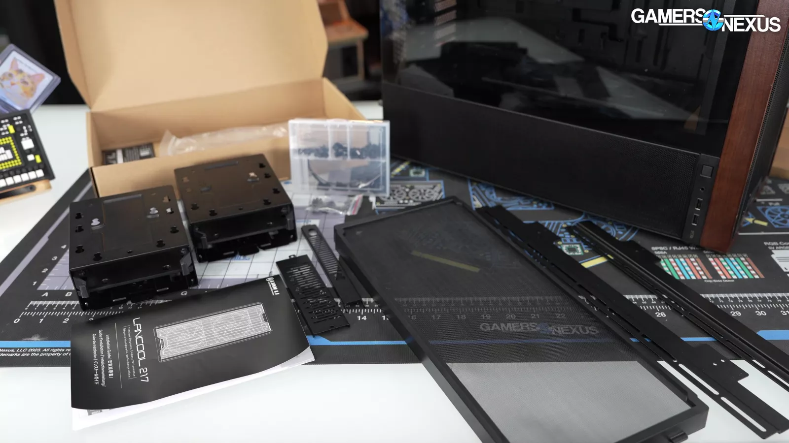 Today we’re reviewing the Lian Li Lancool 217. It's a $120-$125 case and uses weirdly sized fans at 2x 170mm for front intake. Internally, the case comes with 3 more fans. And they're interesting because they are 11-blade ones. The case also comes with wood paneling on the sides, and a lot of mesh ventilation on the front of the case. The lower quarter-panel of the left side also uses mesh to feed intake to the GPU directly via shroud-top holes.
