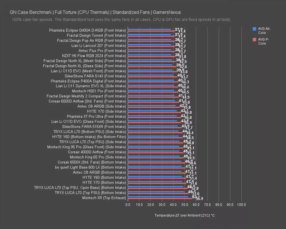 Montech's own moderately more expensive King 95 Pro with a glass front beat the HS cases in this test with an average of 47 degrees above ambient. The Antec C8 ARGB (read our review) is also more expensive, but it has relatively weak CPU cooling with the stock fan layout, and the HS cases beat it by 1-2 degrees. More traditional designs like the Lancool 207 (read our review) and 216 (watch our review) fly past the HS01 and HS02, setting a ceiling and giving perspective on cooling. The G400A (read our review) also accompanies these two.