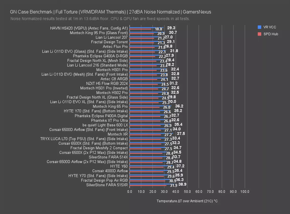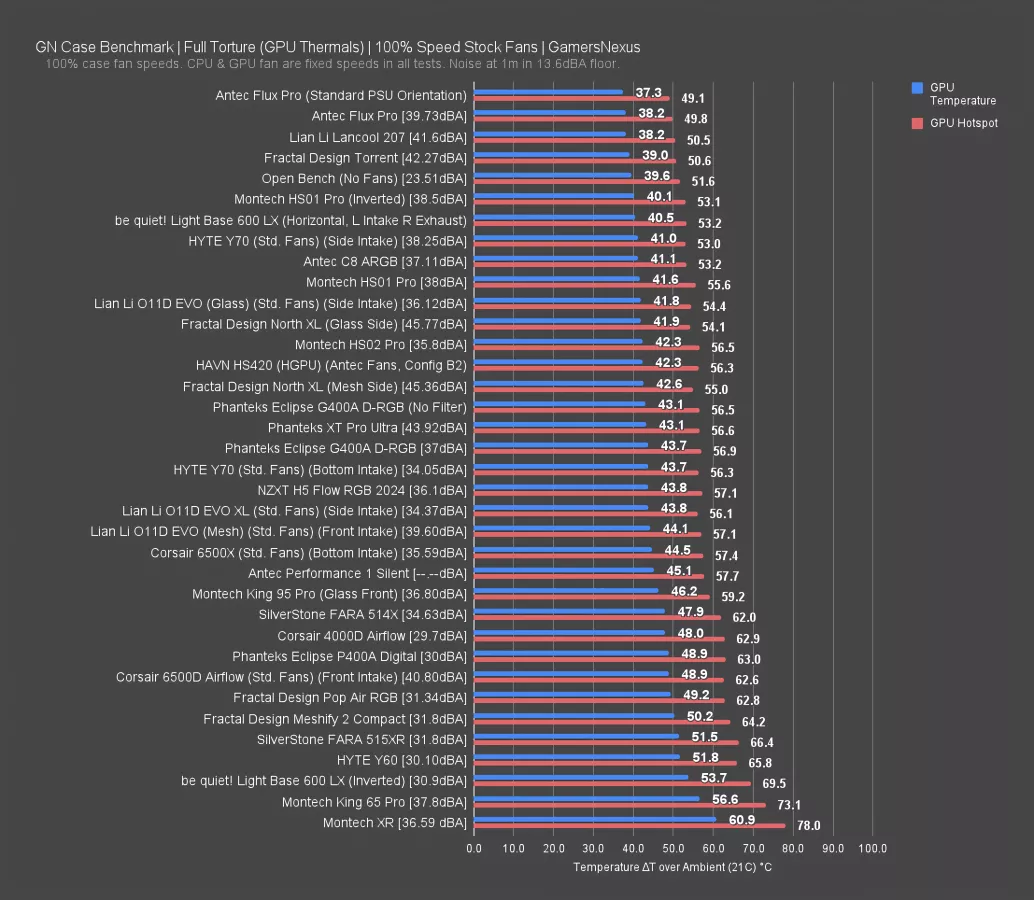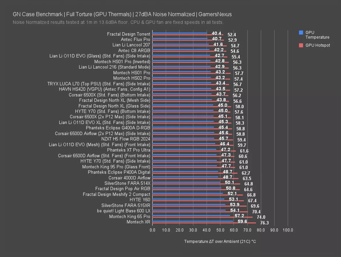 Although the different configurations didn't make much difference, the HS cases performed well overall for GPU thermals, respectably close to the C8 ARGB's 42 degree average. Like the C8, the HS cases have bottom intake fans that force cool air directly into and through the GPU and with minimal obstruction beyond a dust filter. The King 95 Pro also has bottom intake fans, but they're less effective, resulting in a 48 degree average. The Flux Pro and Lancool 207 remain leaders here, but one is in a different price class and both are different styles.