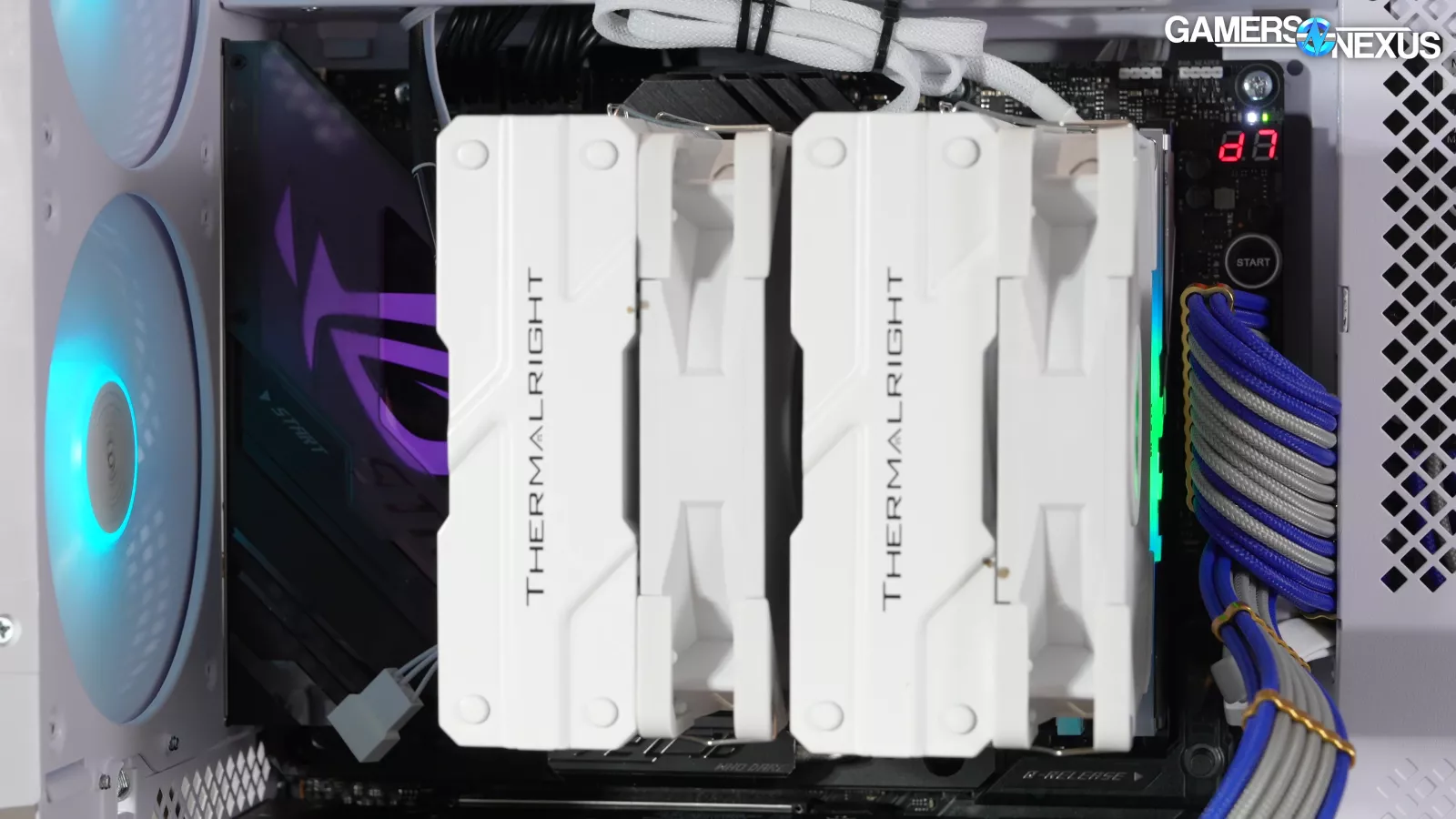 This is mostly an air cooling case, which is how we’re testing it. Radiator support is restricted, though. The front of the HS02 obviously doesn't support radiators since there are no mounts, but even in the HS01, the PSU placement overlaps with the front fan mount. That means there's only space for mounting on the outside of the chassis, and only normal 25mm thick fans fit (no radiators and no extra-thick fans). At the top of the case, Montech claims support for radiators up to 123mm wide, which is a strict limit due to the bumps on the ATX PSU bracket that pokes through, leaving small bumps to interfere with clearance. The bottom mount works fine for radiators other than obstructing the bottom edge of ATX boards, but Montech (correctly) doesn't claim compatibility above 240mm due to the cramped space. There's no 140mm-wide radiator compatibility in either case, and only the HS01 has support for any 140mm fans.