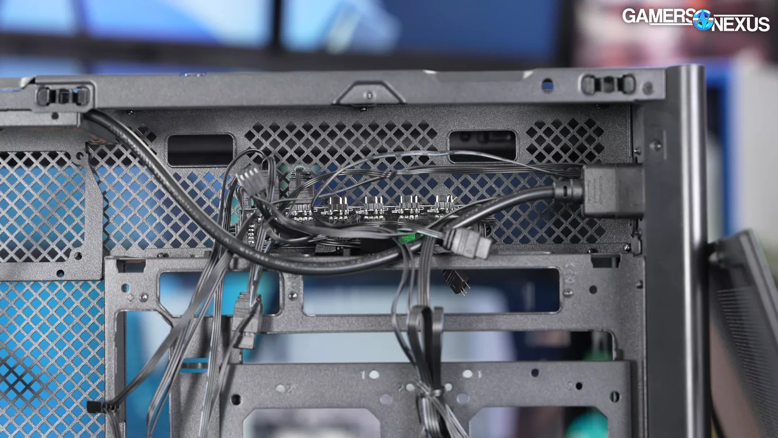 The PSU area leaves a lot to be desired: Unfortunately, we end up with 3 layers of blockages from the PSU case mesh, the interior cover door mesh, and the exterior panel mesh. The two case panels overlap and obstruct each other, which already overlap with the PSU ventilation. Stacking 3 layers atop each other reduces flow and increases resistance, which can increase noise or minimally reduce cooling. Fortunately, PSUs tend to be less thermally sensitive, but we’d like to see fewer overlapping obstructions.