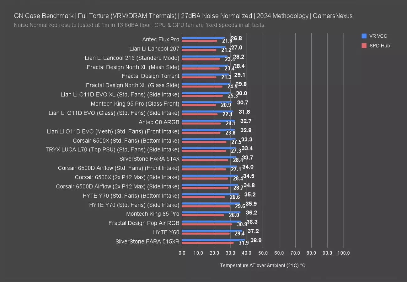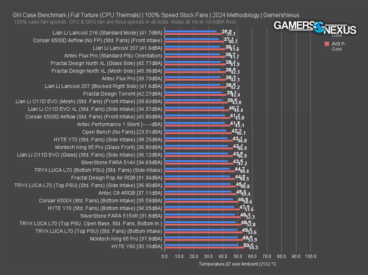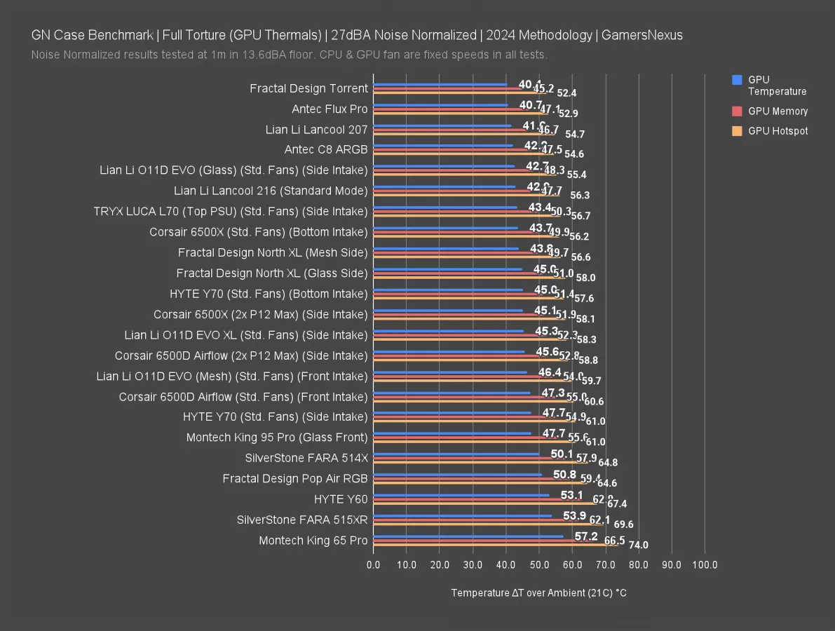 Unfortunately for the King 65 Pro, it’s the new worst result on the charts. These fans just aren’t powerful enough to provide the cooling necessary, and likewise, extra noise created by paneling choices, such as the sharper angles and the obstructions, leads to a need to reduce speed to normalize for noise.
