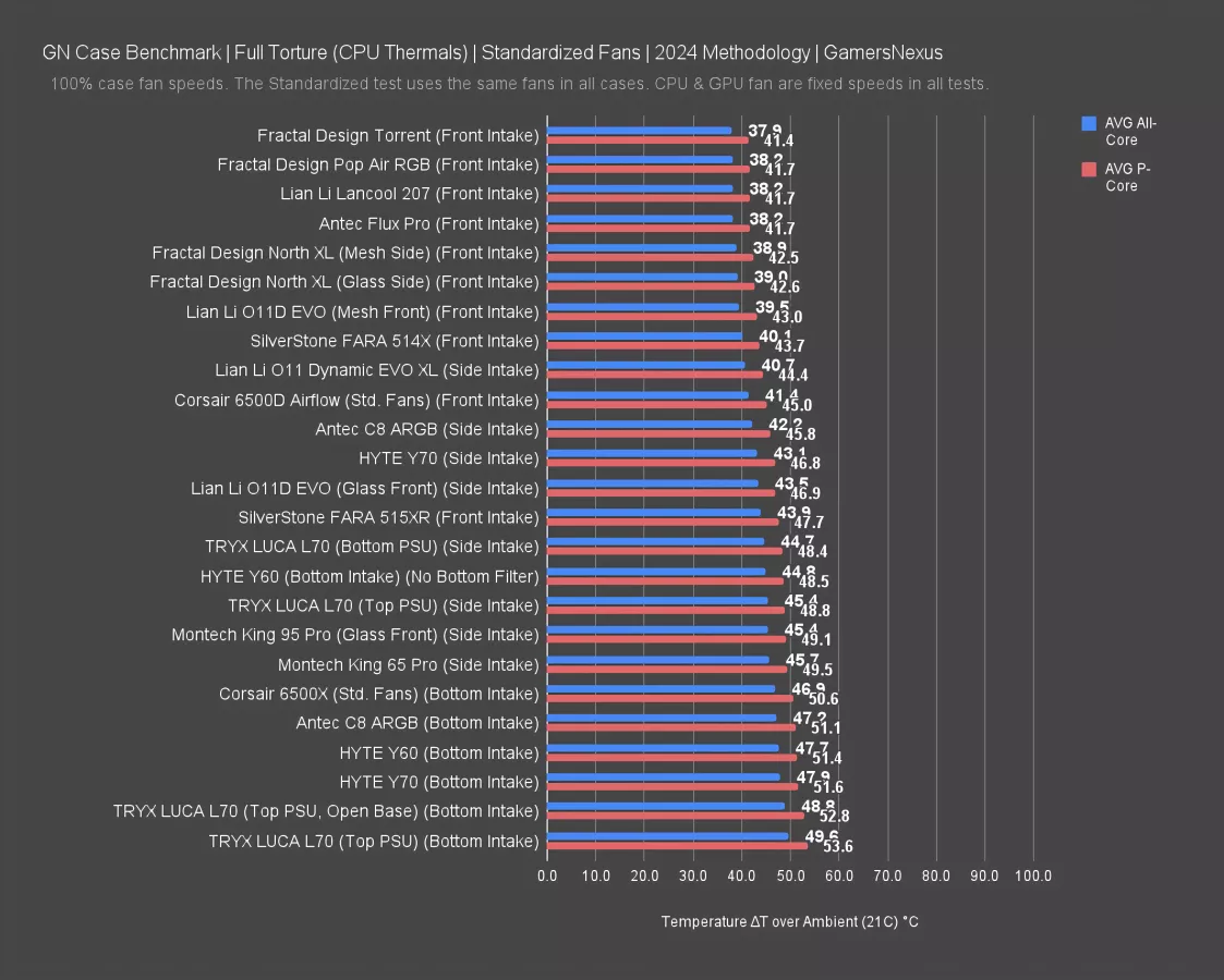 The King 65 Pro lands at 57.6 degrees over ambient for average P-core temperature, putting it behind even the Hyte Y60 (watch our review) in the baseline setup.