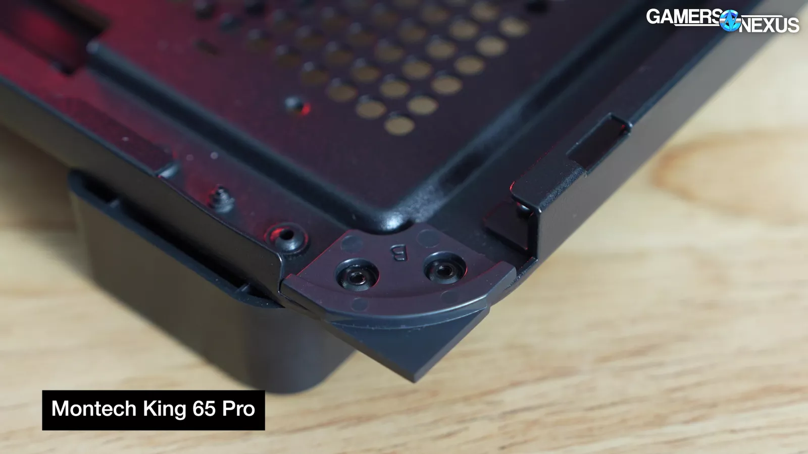The front corner of the top panel is also relatively strong, unlike the Tryx case, because Montech designed it properly. The Tryx case top panel was caving in not from shipping damage, but from design issues, and we want to make sure that plot doesn’t get twisted because it’s important. The King 65 is relatively stout, which helps reduce the top panel length to provide strength, and is also supported by a more significant anchor to the deeper secondary channel, meaning a lengthier attachment point to serve as a counter support on that front edge.