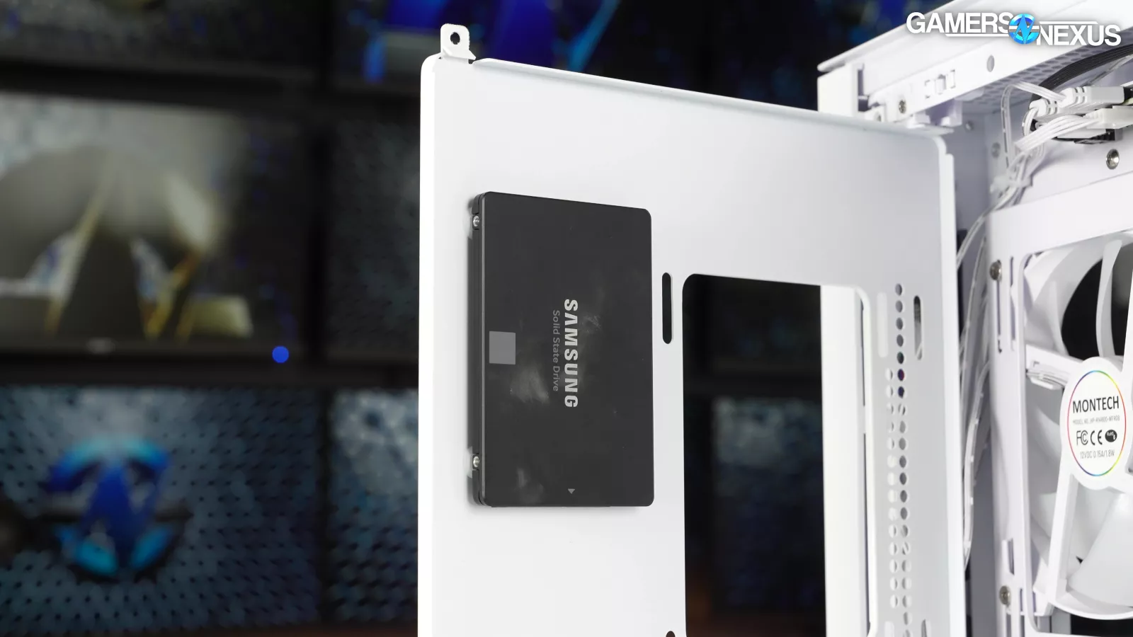 Removing that panel, there’s a cable management cover tray with 2x 2.5” SSD mounts in it. Two screws can be removed to hinge the door outward, giving access to the drive mounts and two additional fan mounts with rails in the door. And this is where we get into an area that Montech could improve.