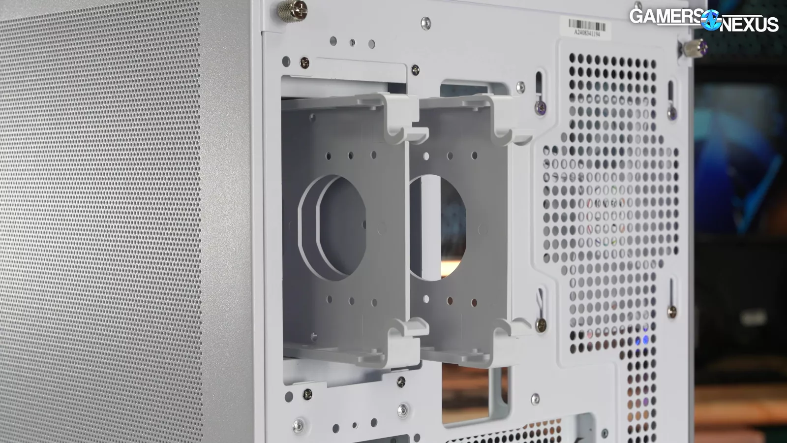 Both sets of fan mounts have heavy obstructions. By accommodating both 120mm and 140mm sizes, Montech needs two sets of mounting points. Unfortunately, in the process of creating these, it has covered up to about 20mm per side of the fan blade, or 40mm total horizontally obstructed. This is a huge amount of intake area loss. Montech could still support two sets of rails, but at least cutting a hole right in the middle would be better -- or even running the rails the entire length of the fan so that there’s some room for air. This is an oversight that likewise extends to the King 95. The King 95 Pro did OK in most of our tests, but falls behind other cases with similar fan count. This is a large contributor to that.