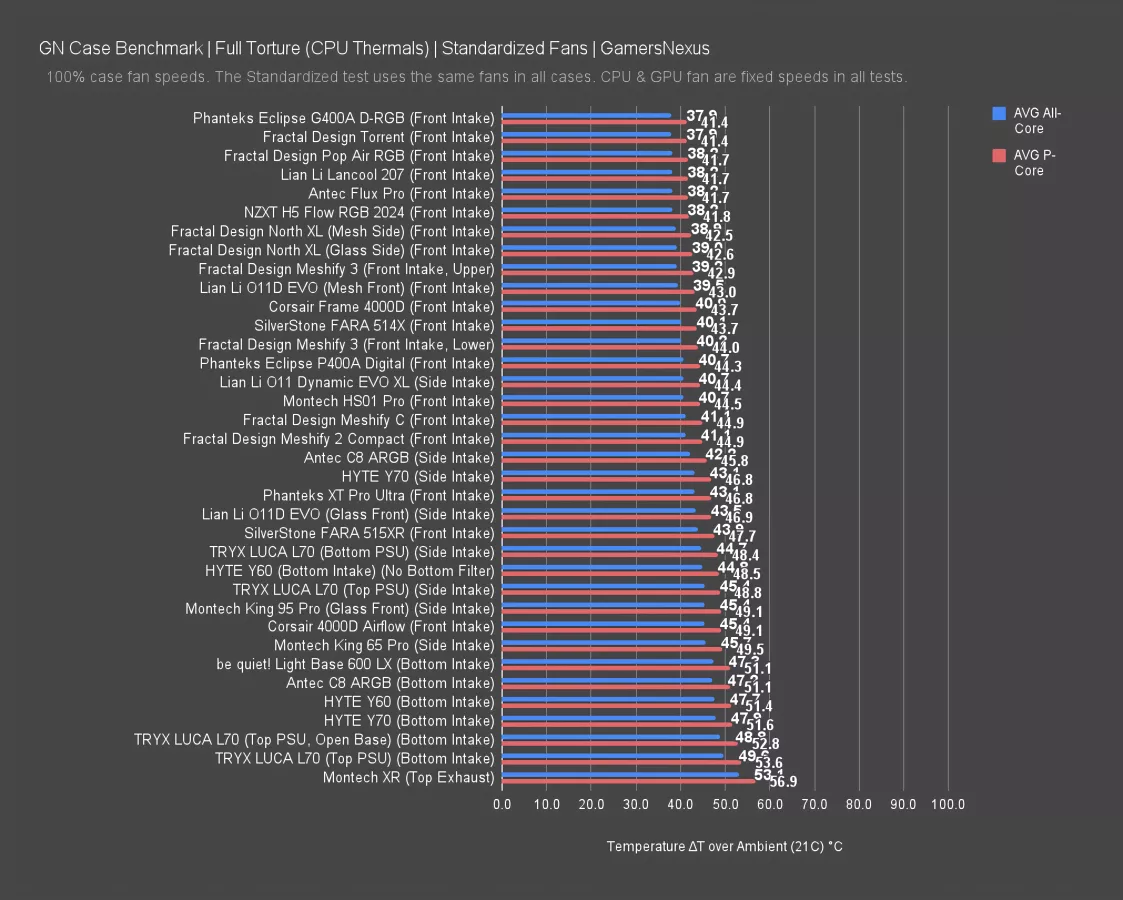 This is the chart. The Fractal Meshify 3 dominates here, planting itself as the new chart leader and within error of the prior leaders. The Meshify 3's all-core average of 40 degrees Celsius over ambient and 44 degrees for the P-cores is significantly better than previous efforts from the Meshify 2 Compact (watch our review) at 48 degrees average and the Meshify C at 54. Those two cases shared a basic design. The Meshify 3 is more of a departure; Fractal has added an airflow guide to the bottom of the case, the stock fans are higher performance, and all three stock fans are installed in the front of the case.