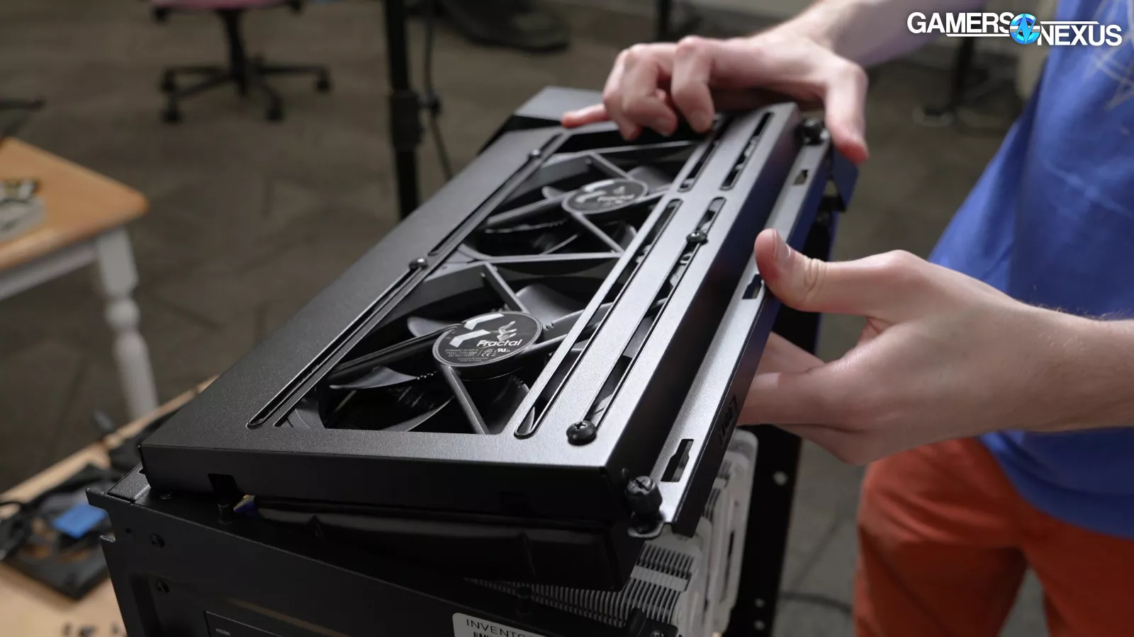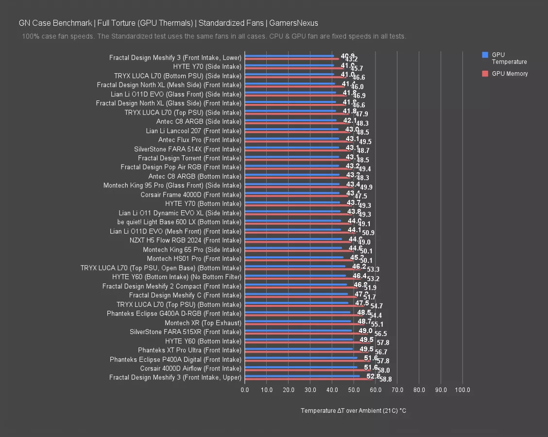 The Meshify C and Meshify 2 Compact both had GPU averages of 47 degrees above ambient, while the Meshify 3 literally bookended the chart at 41 degrees with the fans in the lower slots and 53 degrees in the upper ones. If you alter the stock fan configuration, be sure to at least keep one fan in the bottom slot at the front of the case.