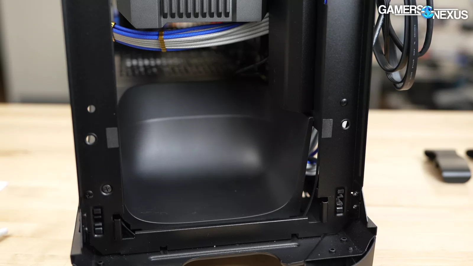 It reminds us a little of the NZXT toilet bowl fan from the 2022 H5 Flow (watch our review), but more so the extremely similar "PSU optional cover plate" from Corsair's old 5000D Airflow (watch our review). The 5000D Airflow's single intake fan wasn't positioned to make that part matter, though, whereas the Meshify 3's intake-heavy configuration will actually benefit.