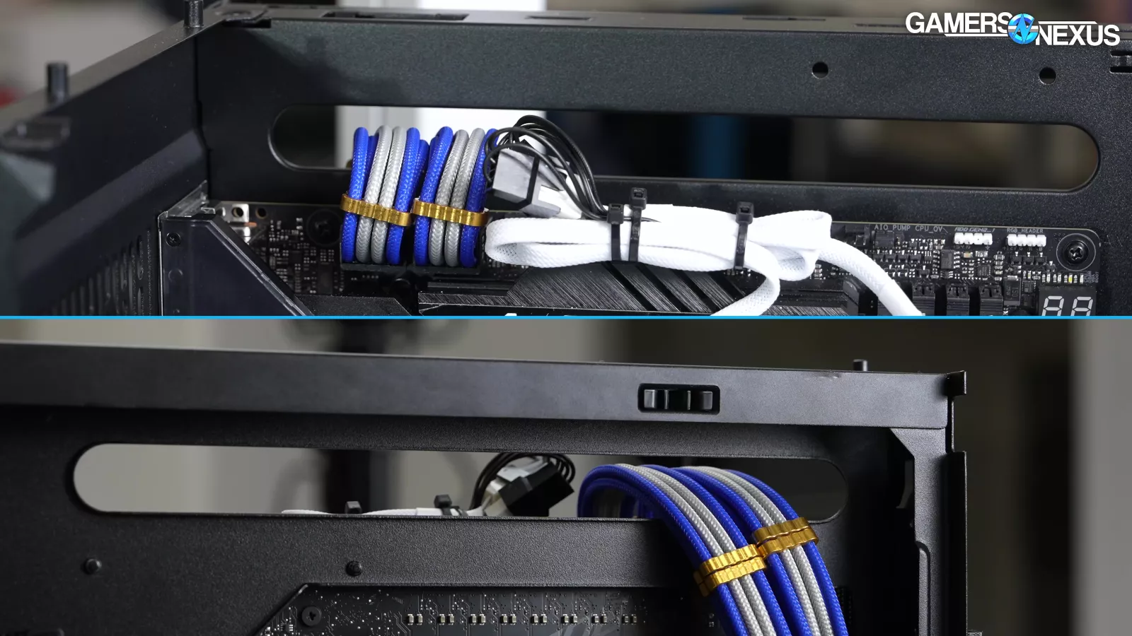 There's a massive cutout above the motherboard that runs its entire length, although the cutout at the bottom is undersized and difficult to use when an ATX board is installed. Overall, cable management is above average thanks to the cable aligners and the amount of space, with some velcro straps on the back for exterior cable management.
