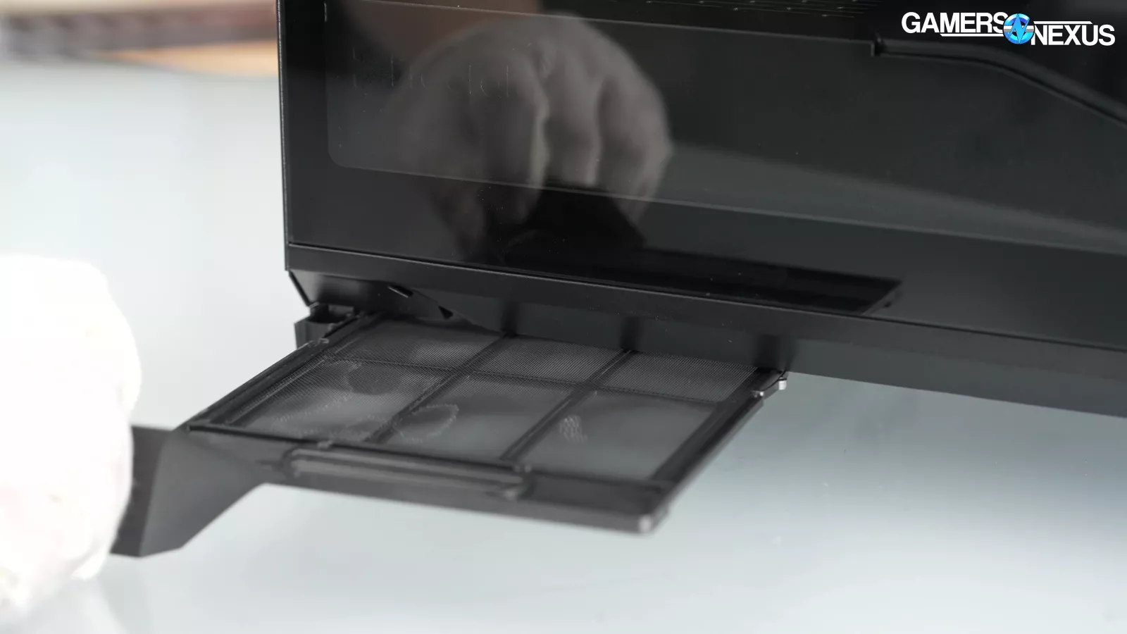 The only discrete dust filter in the case is for the PSU. It ejects from the side, which is always a plus for ease of removal, but it's also built into the leg of the case so that there's no externally visible handle. This is completely unnecessary, but it's one of those small features that shows the care that was put into the case's appearance and great attention to detail.