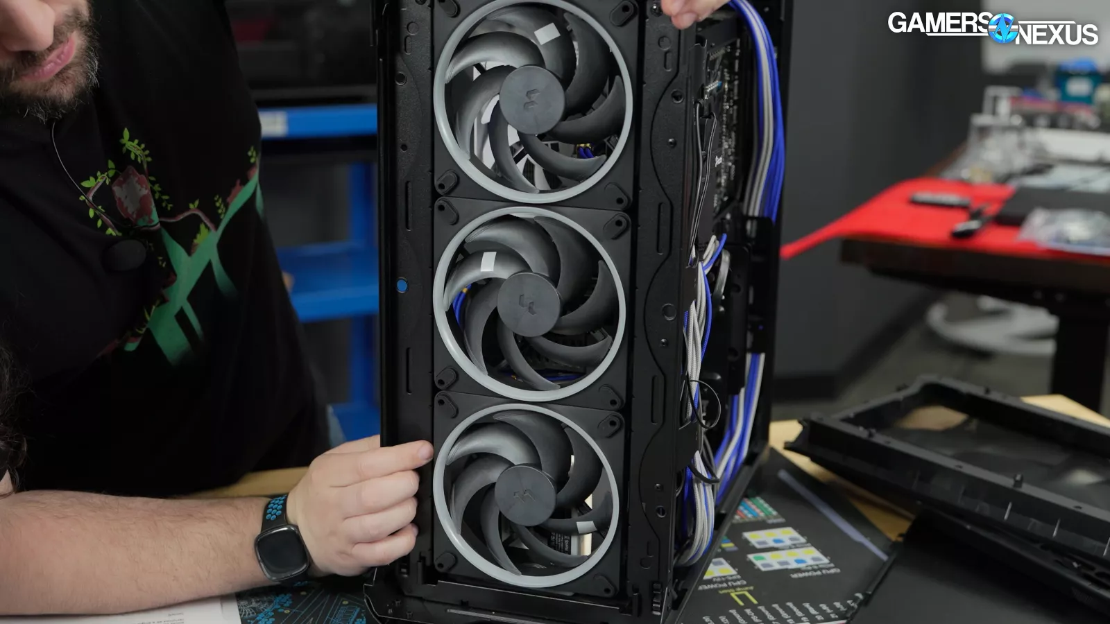 The Meshify 3 has three defined 140mm fan mounting locations at the front, so rather than sticking our two 140mm intake fans somewhere in the middle, we were forced to pick either the upper two slots or the lower two.