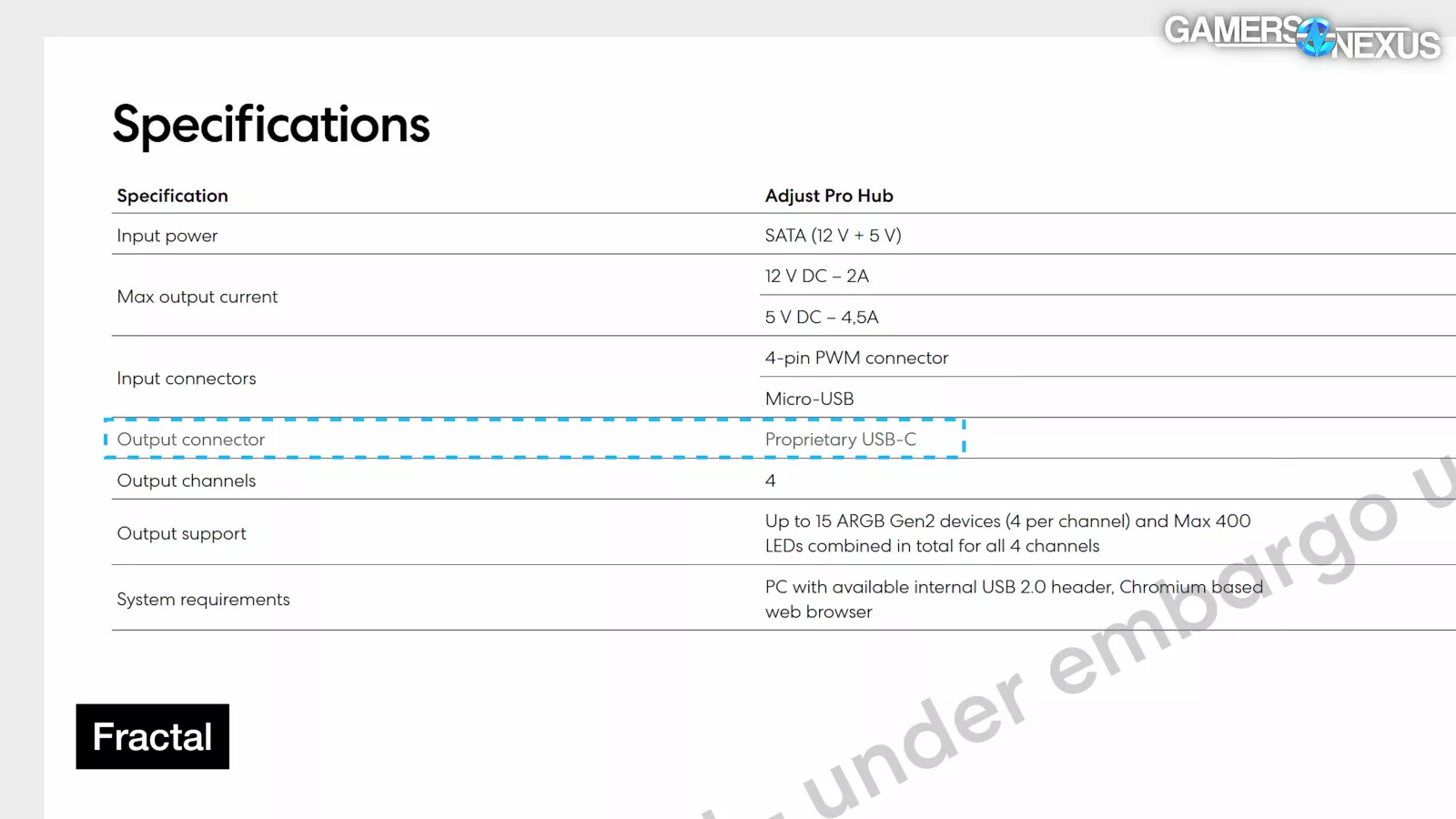 The Momentum RGB fans connect through daisy-chained USB Type-C connectors. Fractal describes the connector as "Proprietary USB-C," meaning that the connectors are just USB-shaped out of convenience; the fans are NOT USB devices.