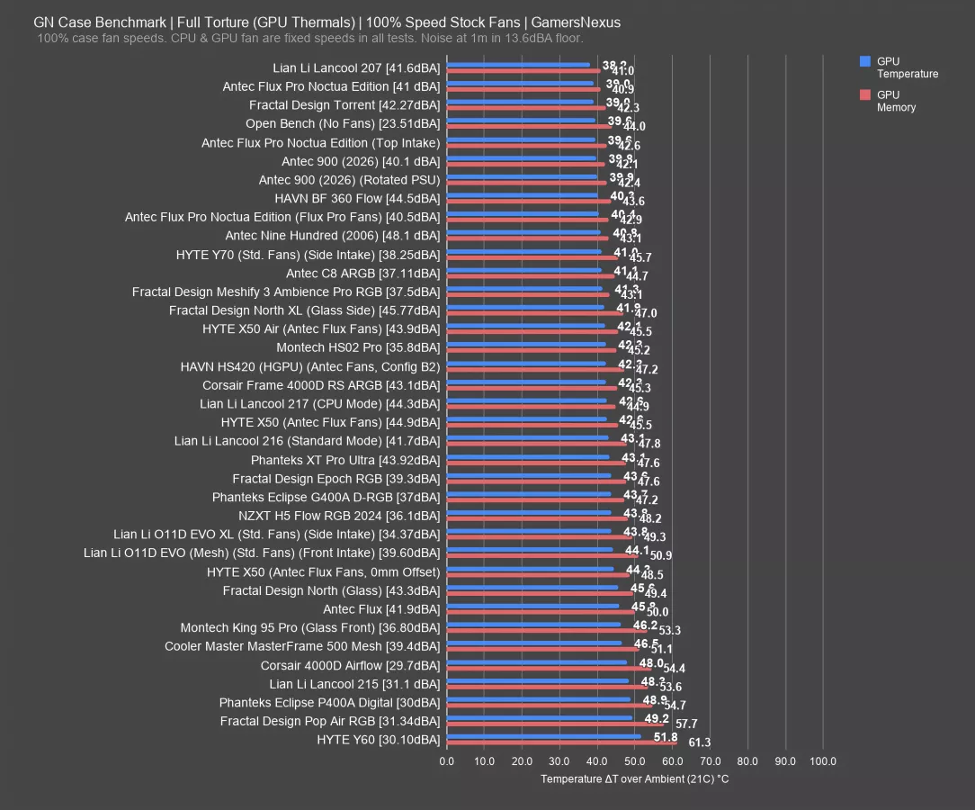 The configuration where we moved the shroud-top fan biased front to the top-front of the case as intake loses ground here, predictably, since it’s more designed to benefit the CPU than the GPU. The configuration held 39.6 degrees over ambient for the GPU temperature, which has it slightly better still than the default layout Flux Pro fans in the Noctua Edition Flux Pro case.