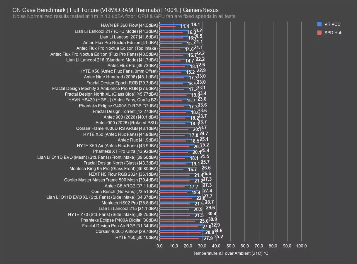 The best results on this chart include the HAVN BF 360, which crushes everyone else for the DDR5 thermals, followed by the Lancool 217 in CPU mode, then the 207. The Noctua Flux Pro runs at the same noise level as the 207, so is effectively noise normalized, and runs 0.6 degrees warmer on the VR VCC result and 1 degree different for the DDR5 result. In other words, these are the same and within reasonable variance.