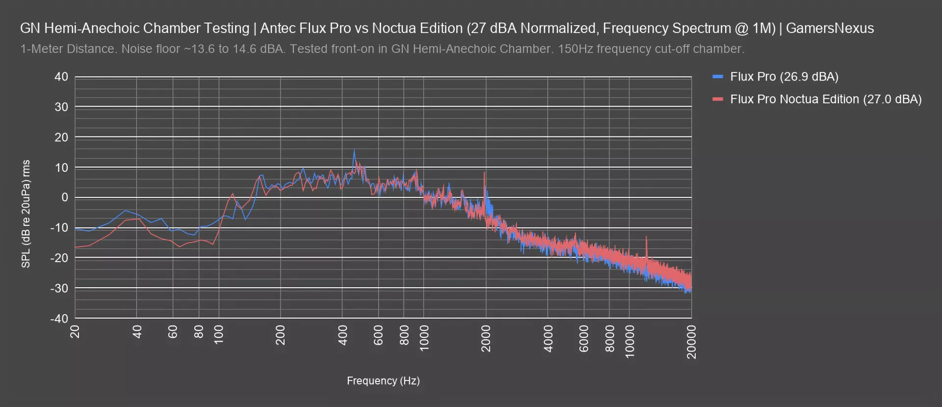 To compare the original Flux Pro and the Noctua Edition, we've selected tests which were noise-normalized to 27 dBA SPL. Although the case fans are different brands and different styles, the frequency curves are similar, with corresponding peaks near 120Hz, 250Hz, and 470 Hz. There's not an obvious difference in the character of the noise generated based on these charts. The components installed in the cases were exactly the same, so some similarity is to be expected.