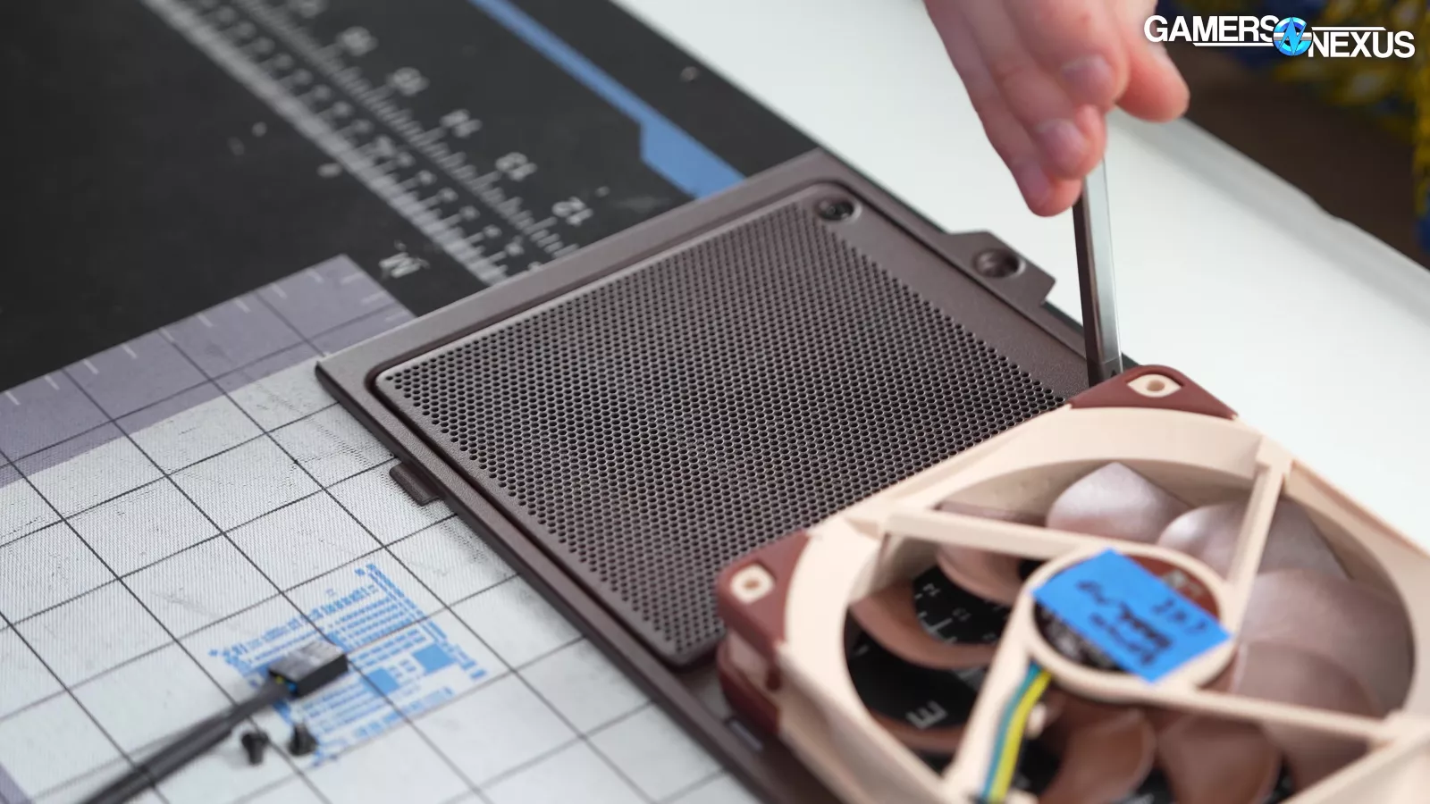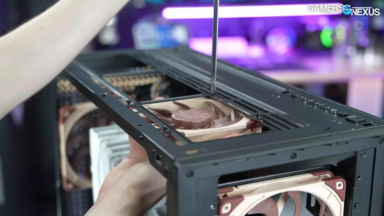 We started out by installing fans in the same locations as the Antec Flux Pro to provide a direct A/B comparison. We installed the fans in the ABABAB alternating pattern for RPM offsets of the A12 G2 and A14 G2 series, per the manual, to test the marketing claims. Also following the manual like a real end user would, we swapped the fan screws for the recommended NA-AV4 anti-vibration mounts. We also did a test configuration with the screws instead, without the guided ABABAB tuning for the fans (meaning randomly mixing the fans), and with cable management messier.
