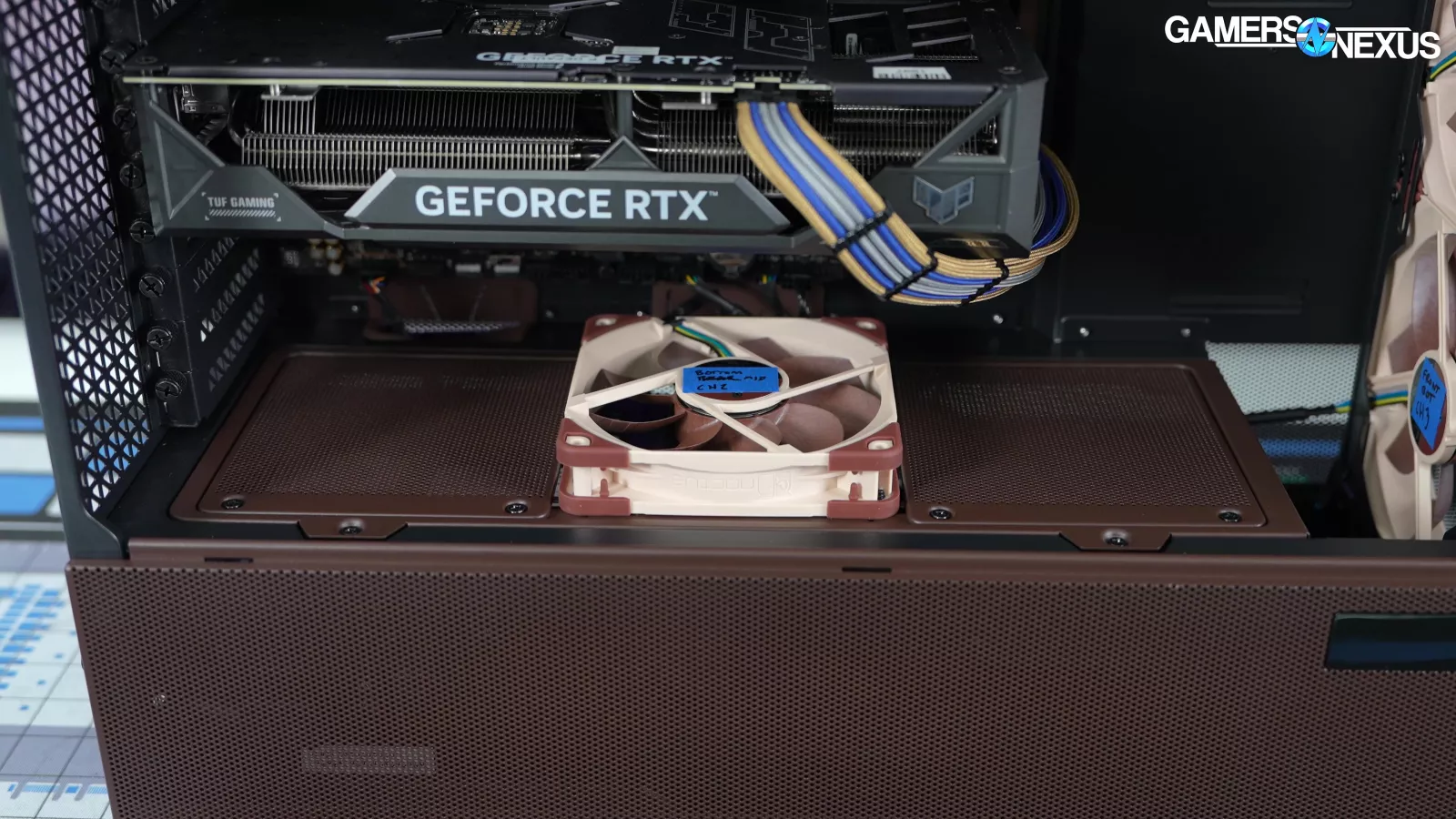 This has to do with the pressure system being formed in the case: The shroud fans are changing where the air enters the system, and with Noctua having a significantly better static pressure result for its fans versus Antec’s reverse blade fans, we think that these are overpowering air that would otherwise possibly be drawn in through the PCIe expansion slots and the ventilation at the back, lower-side of the case. We’ve seen this in the past with other cases.