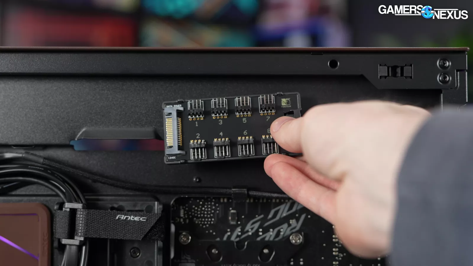 The included fan kit includes fan screws and the NA-AV4 "anti-vibration mounts" that serve as silicone sticks that substitute for screws. The included fan hub is magnetic for easy movement anywhere in the case, takes SATA power and PWM input, has eight channels, and is pre-wired with extensions to reach the suggested fan mounts. The hub is a well-equipped fan hub that Noctua already sells. Eight outputs is an improvement versus the original Antec option, which only had five outputs for six fans.