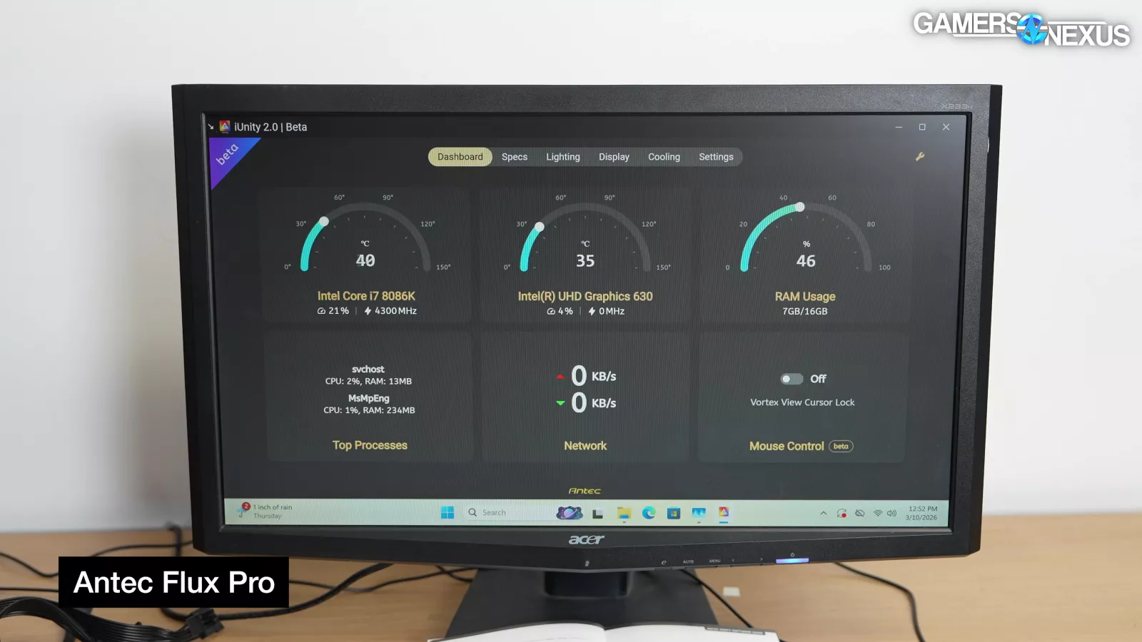 The display on the side of the case can show GPU temperature and/or CPU temperature. It requires Antec's "iUnity" software to run, so our preference is to ignore it. If you want to use iUnity, you currently have to download it from the Vortex View 360 download section on Antec's site.