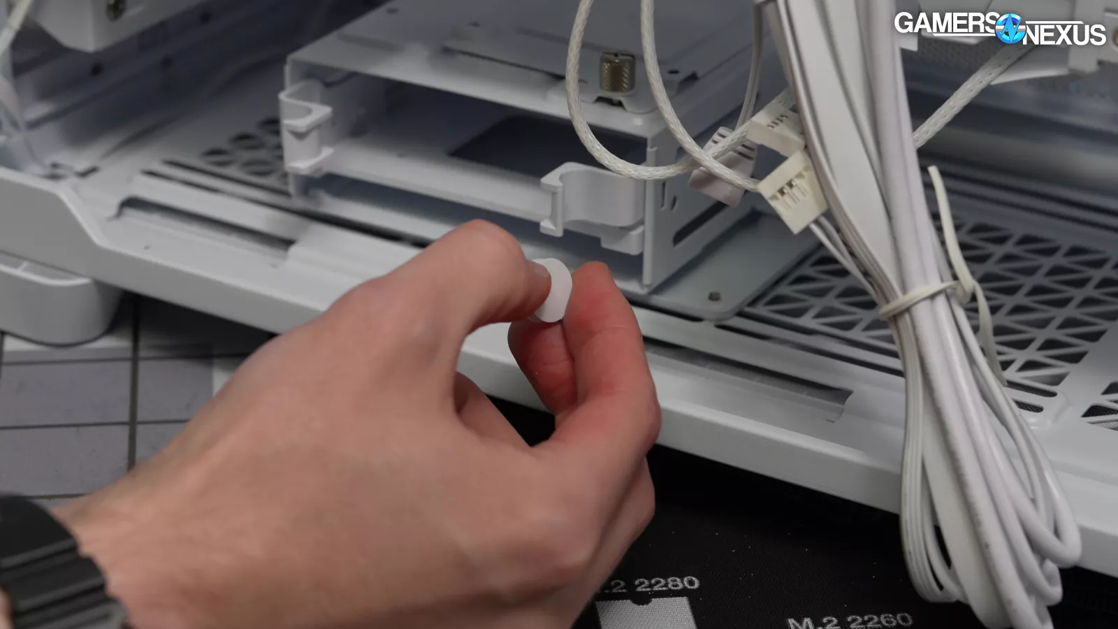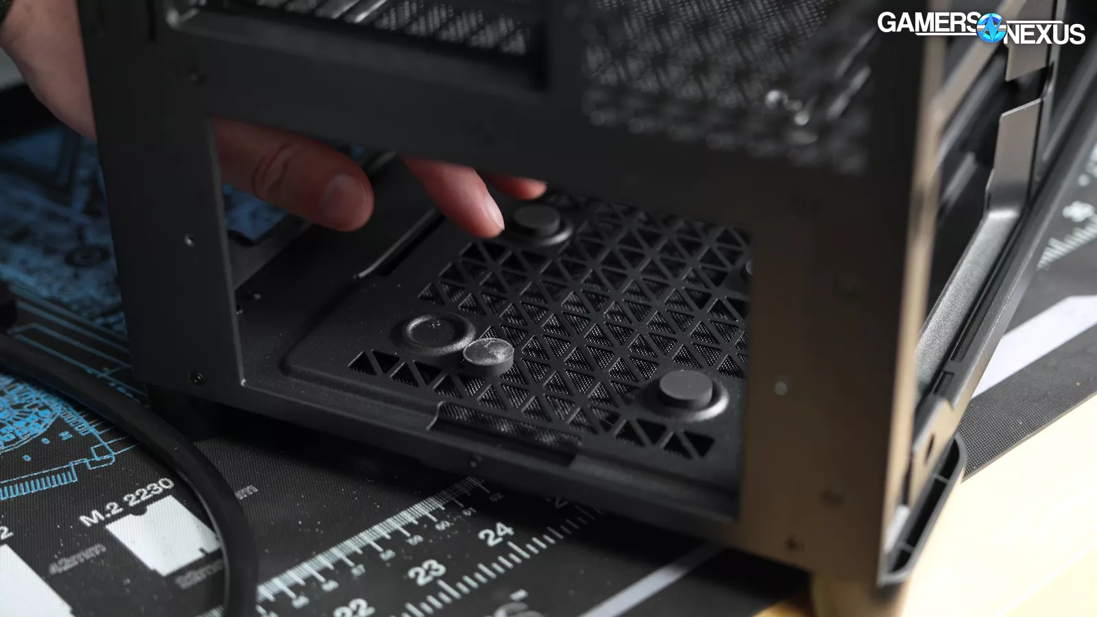Finally, the rubber pads for supporting the PSU had fallen off in shipping in our original Flux Pro, and it happened again in the Noctua Edition. If you order a Flux Pro, check inside the shroud to make sure all four rubber circles are still stuck on. Given that this has now happened to us twice on known review units, we have to assume this is an Antec manufacturing issue -- such as with the adhesive choice or with the curing time for it. It’s a small and mostly irrelevant point, but on a case this expensive, they had plenty of time to fix a known issue.