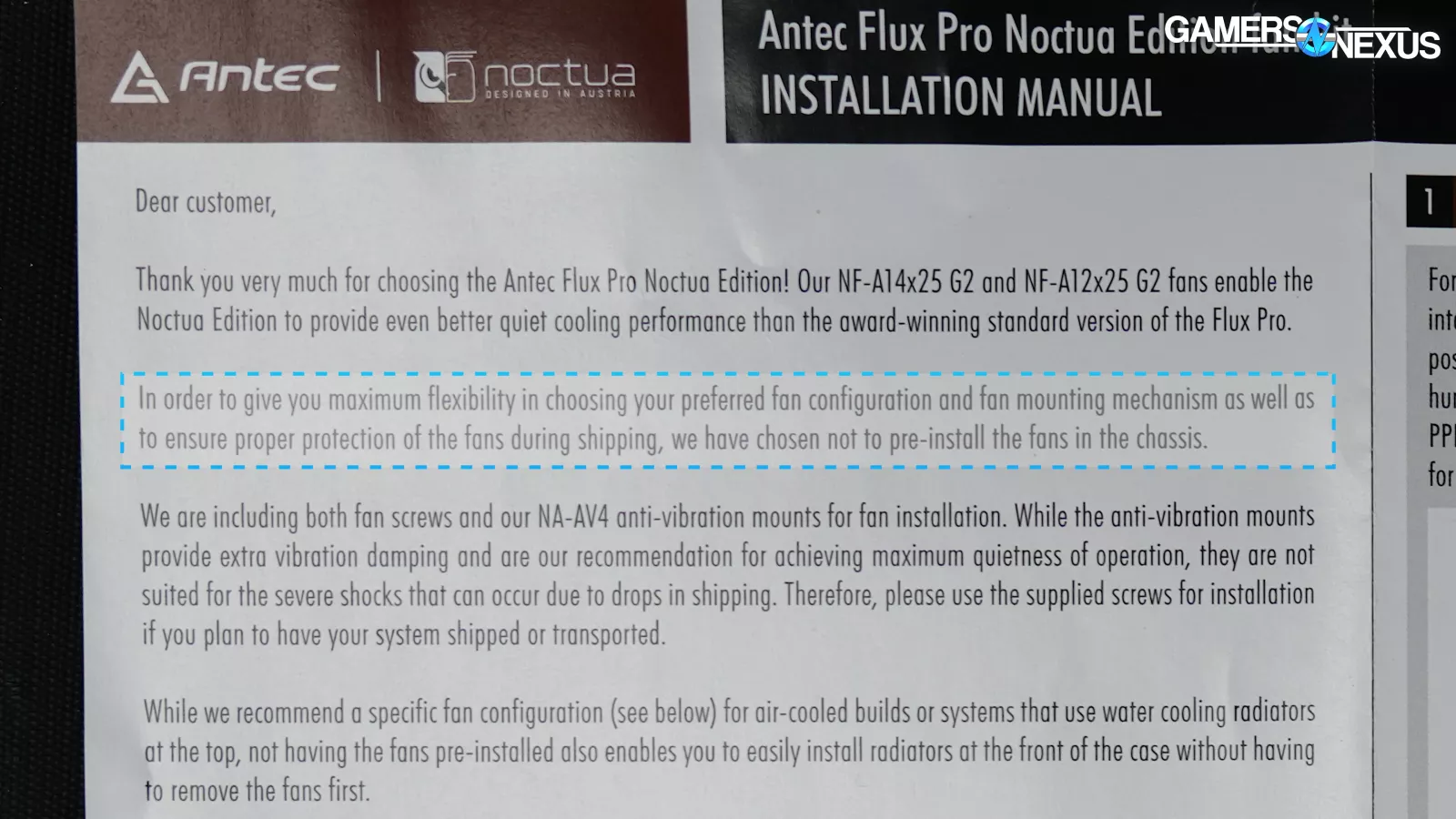 That's fair enough, and it also means that it’s cheaper for them by reducing assembly time, but the manual still recommends installing the fans in the same locations as the stock Flux Pro. Because that’s the most likely configuration for users to follow and to have a better A/B, we tested that one with one alternative.