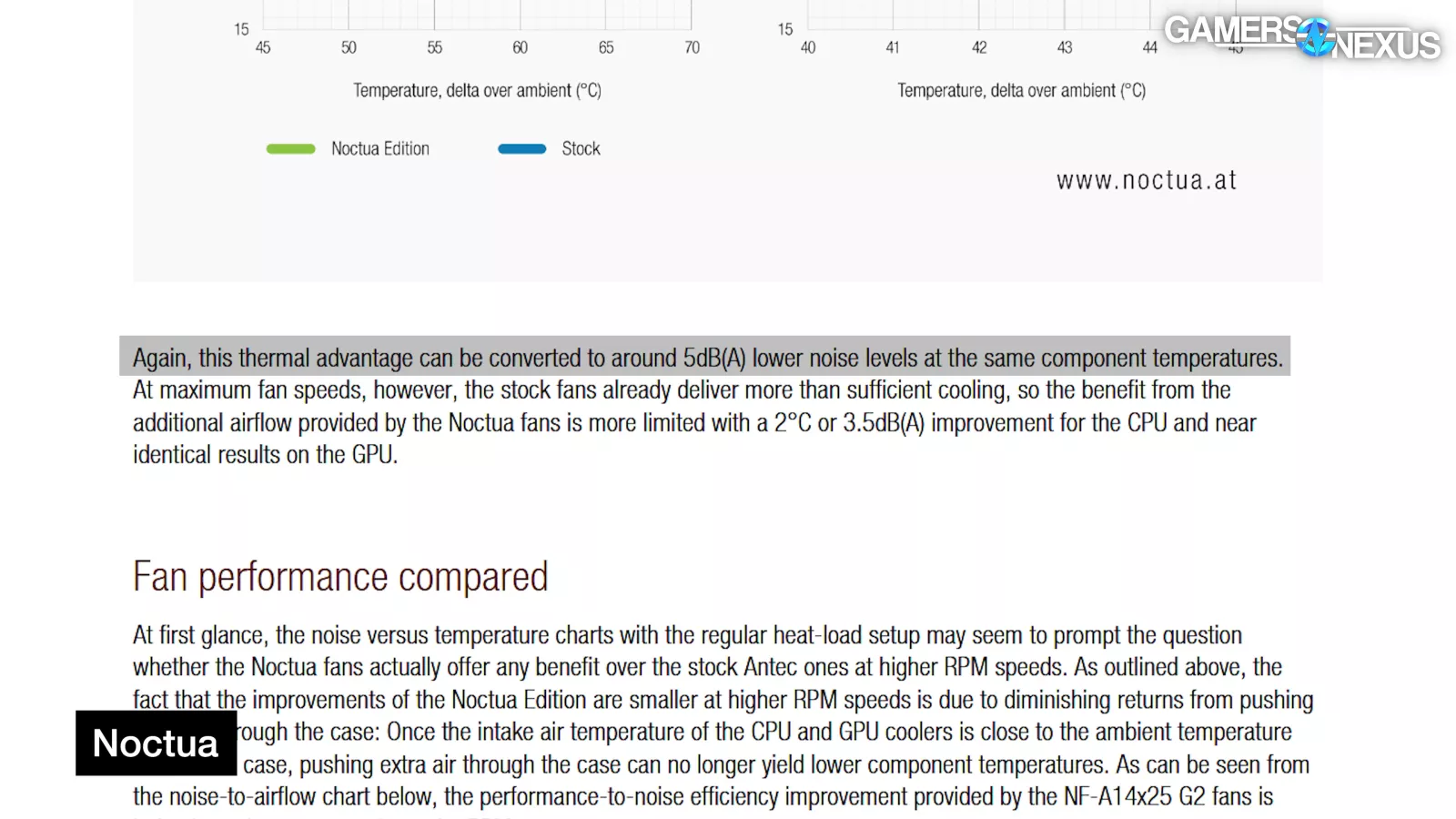 Noctua claims that its fans offer noise and thermal benefits, but Antec's stock fans are already pretty good, and with our hardware, we couldn’t replicate the kind of improvements Noctua saw in its own testing.