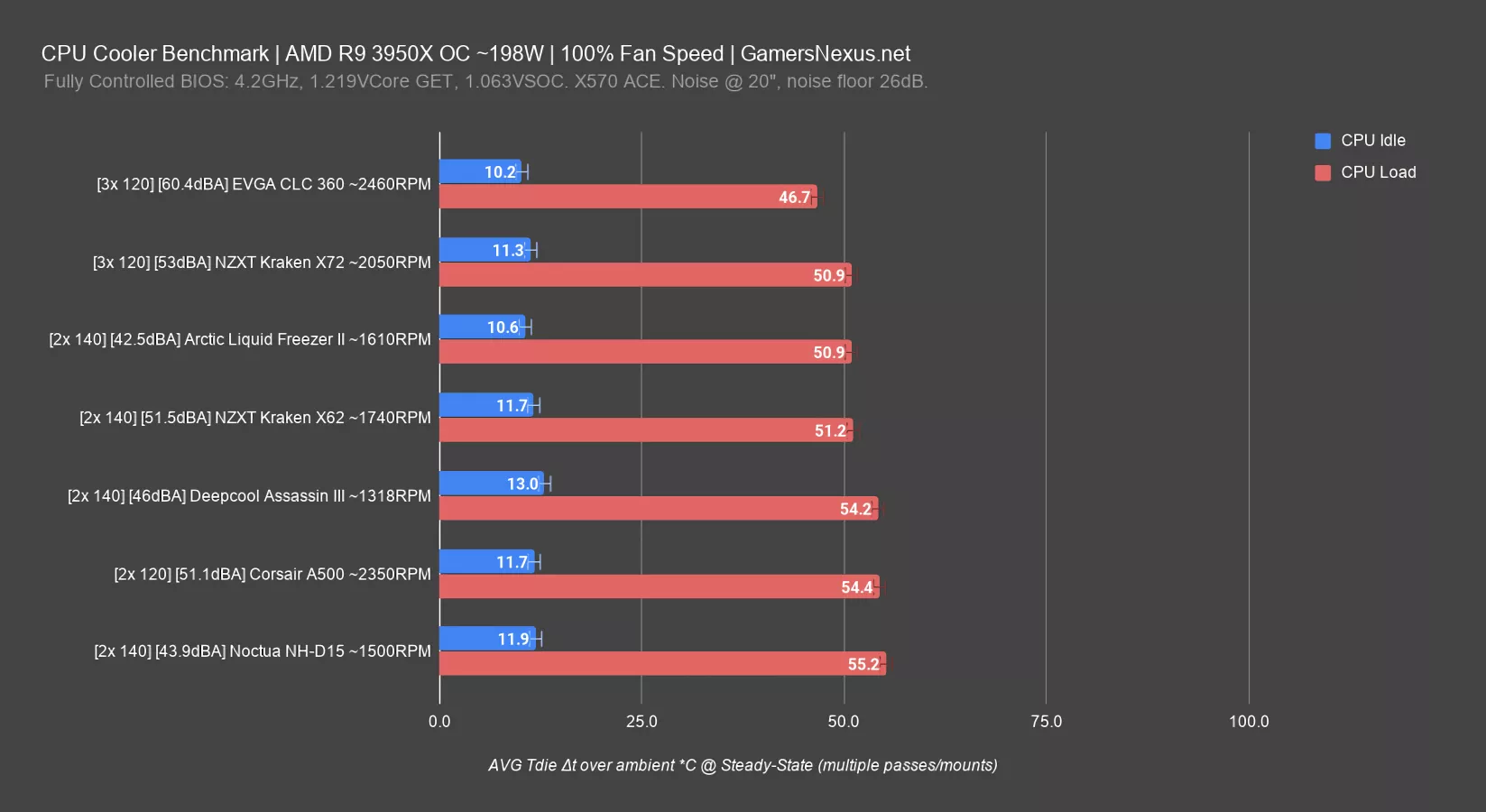 Our next chart will be of the VRM fan performance, but we’ll start with the one everyone is used to. For this one, we’re using a 200W workload with the AMD R9 3950X, which is more useful for stressing the differences in high-end coolers. This test is equalized to 35dBA in order to level the playing field so that coolers can’t just brute-force their way to the top, like the EVGA CLC 360 would do at its 60dBA baseline for noise at 100% speed.