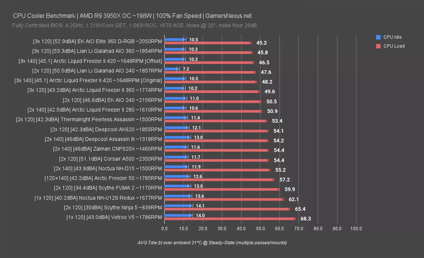 Our next test shows all of the coolers with their fans at 100% speed. This allows coolers with more powerful fans to brute force their way higher in the chart with the trade-off being higher noise levels.