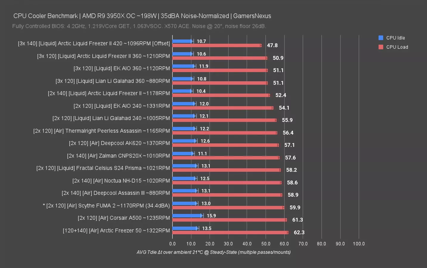 Liquid coolers outperform the Peerless Assassin 120, especially the Arctic Liquid Freezer II 280 at 3.5 degrees Celsius cooler. It’s a noticeable difference, and the newer offset brackets for the Liquid Freezer would give you another 1-2 degrees on top of that, but it’s also over 2x the price. Still, you could run the Liquid Freezer II even quieter than the Peerless Assassin while getting the same thermals, so there is some benefit there depending on what type of user you are.