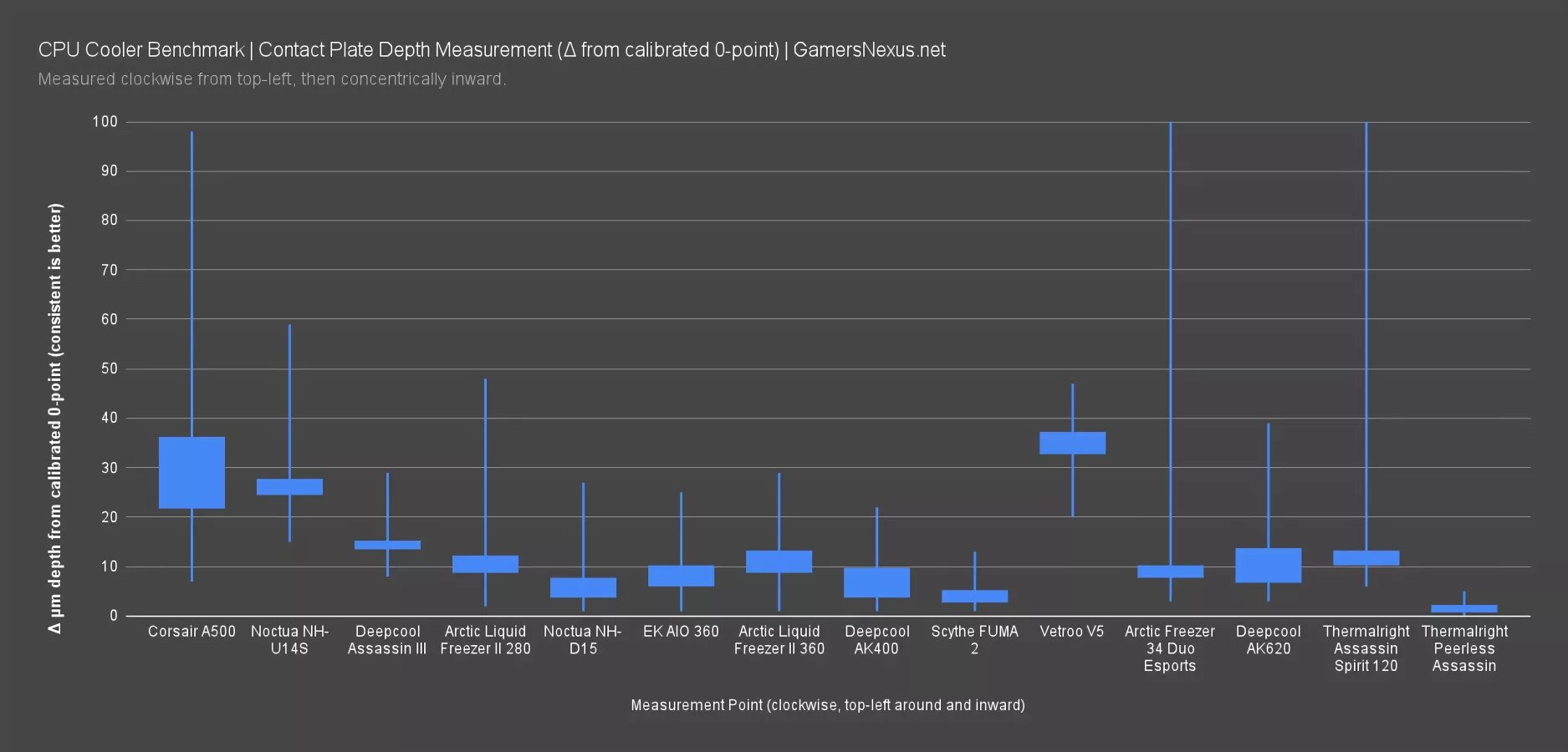 Flatness of the coldplate is next. We use a special tool to measure in microns from a calibrated zero-point. This helps us show the pits and valleys within the coldplate design. The Peerless Assassin 120 is impressive here, with one of the flattest results we’ve seen, coming in just ahead of the Scythe FUMA 2, and far better than coolers like the Corsair A500.