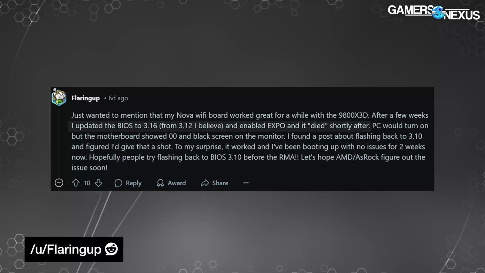 User u/Eldaroth explained that a 3.10 flashback didn’t immediately solve the problem, but after a second attempt at a 3.05 flashback, Eldaroth was able to “revive” the system. From there, the user flashed back to newer BIOSes and found 3.10 was the latest option working for the build.
