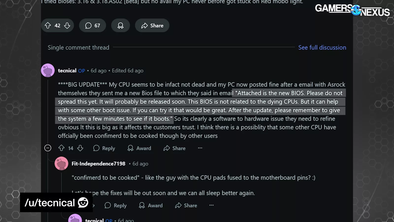 Other users claim they “revived” their seemingly dead CPU by downgrading to a previous BIOS, and ASRock sent two users a then-unreleased BIOS that resolved their issues, but asked them not to share it.